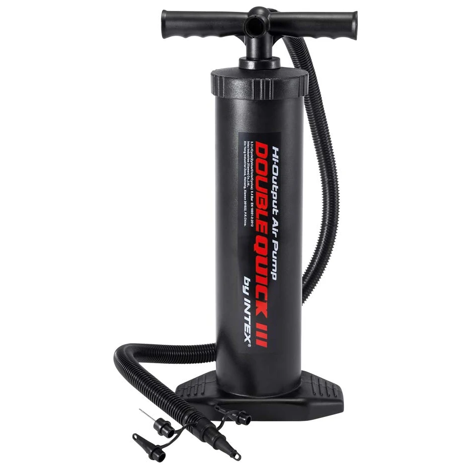 Die leistungsstärkste der gleichnamigen Linie praktischer Handpumpen, die Double Quick III Handpumpe der Firma Intex, pumpt neben Outdoor-Equipment auch Bälle mit bis zu 55 kPa auf.