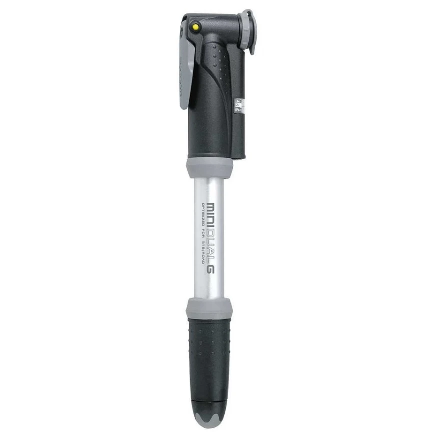 Leistungsstarke Dual-Cyclo- Pumpe Topeak Mini Dual G, die die aufgewendete Energie maximal nutzt. Die Pumpe verfügt über ein integriertes Druckbalkendiagramm.