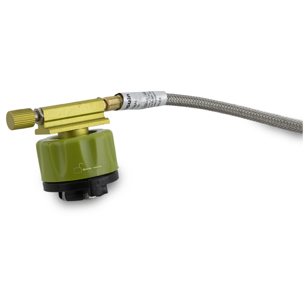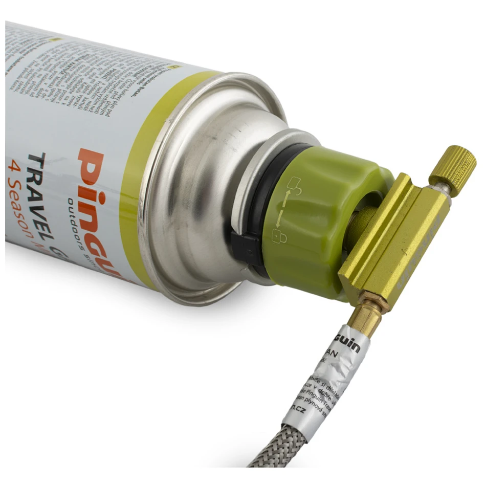 Der Adapter 220g Reduzierung von Pinquin gewährleistet den einfachen und schnellen Anschluss eines Kochers mit Standardgewinde an eine sehr kompakte Bajonett-220g-Kartusche.