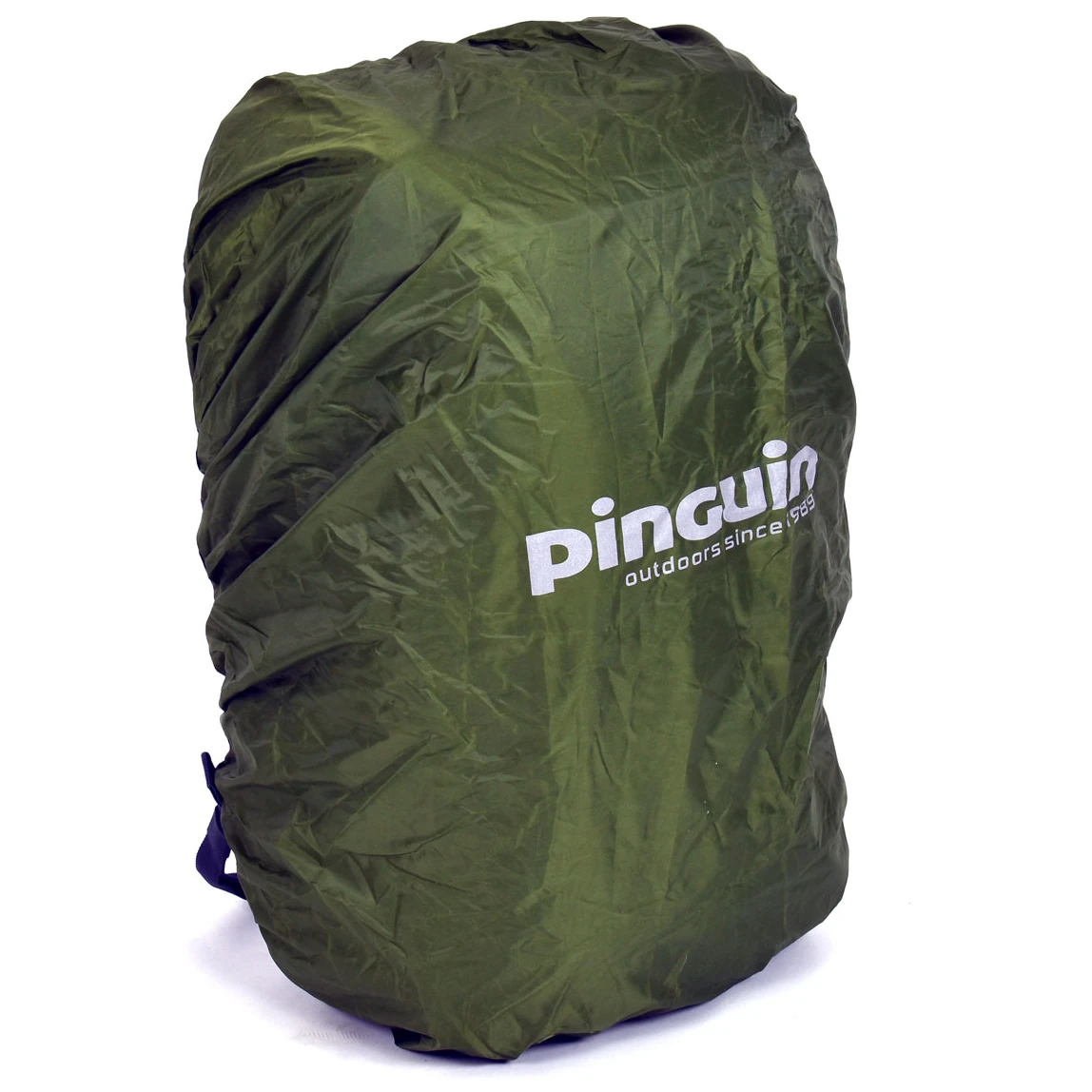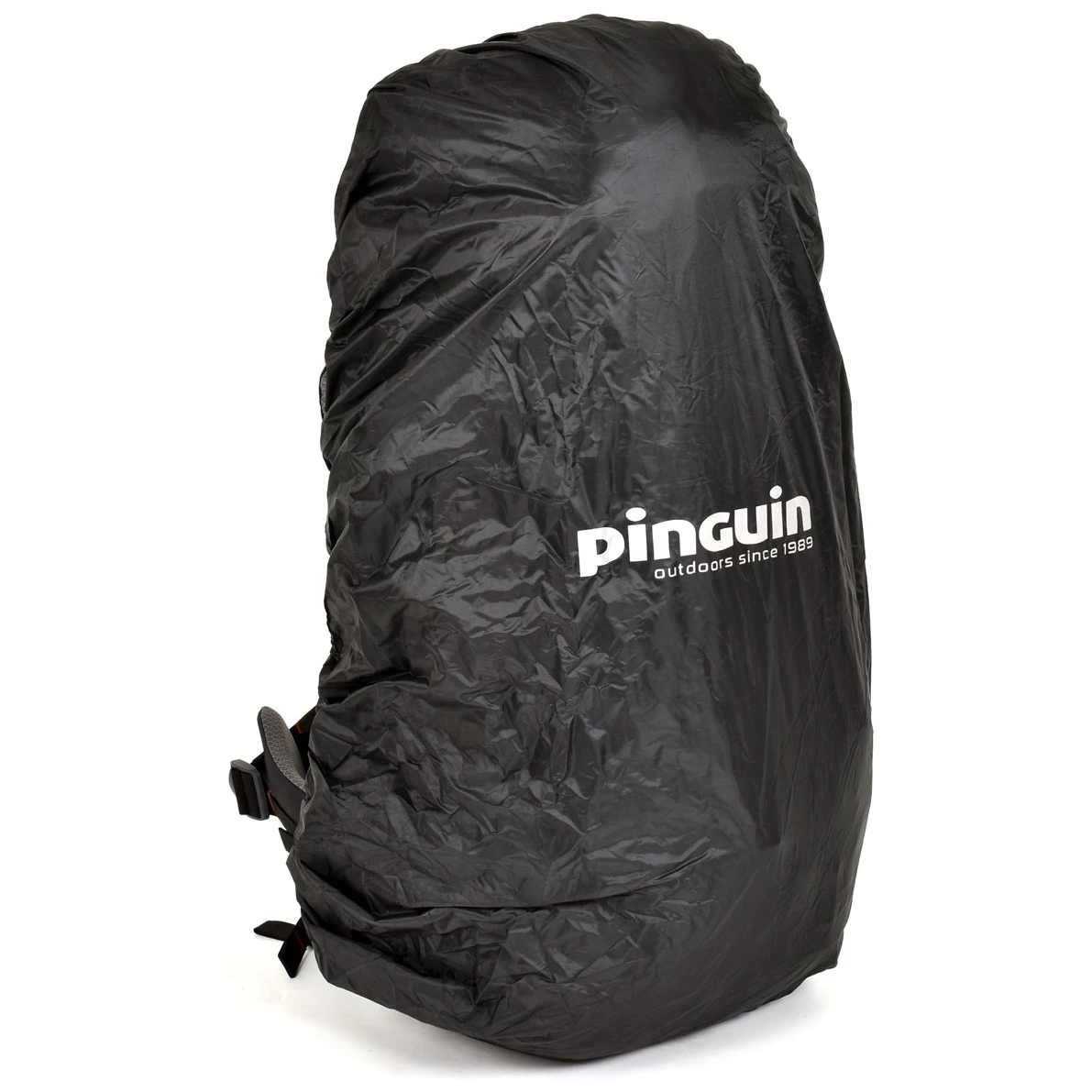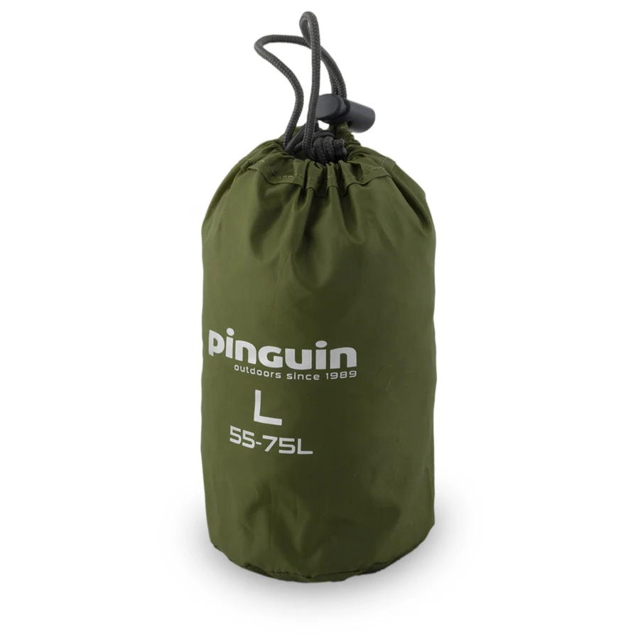 Der wasserdichte Nylon-Regenmantel für Rucksäcke in der Größe L (55–75 l) der Marke Pinguin mit markantem Reflektordruck ist sehr leicht.