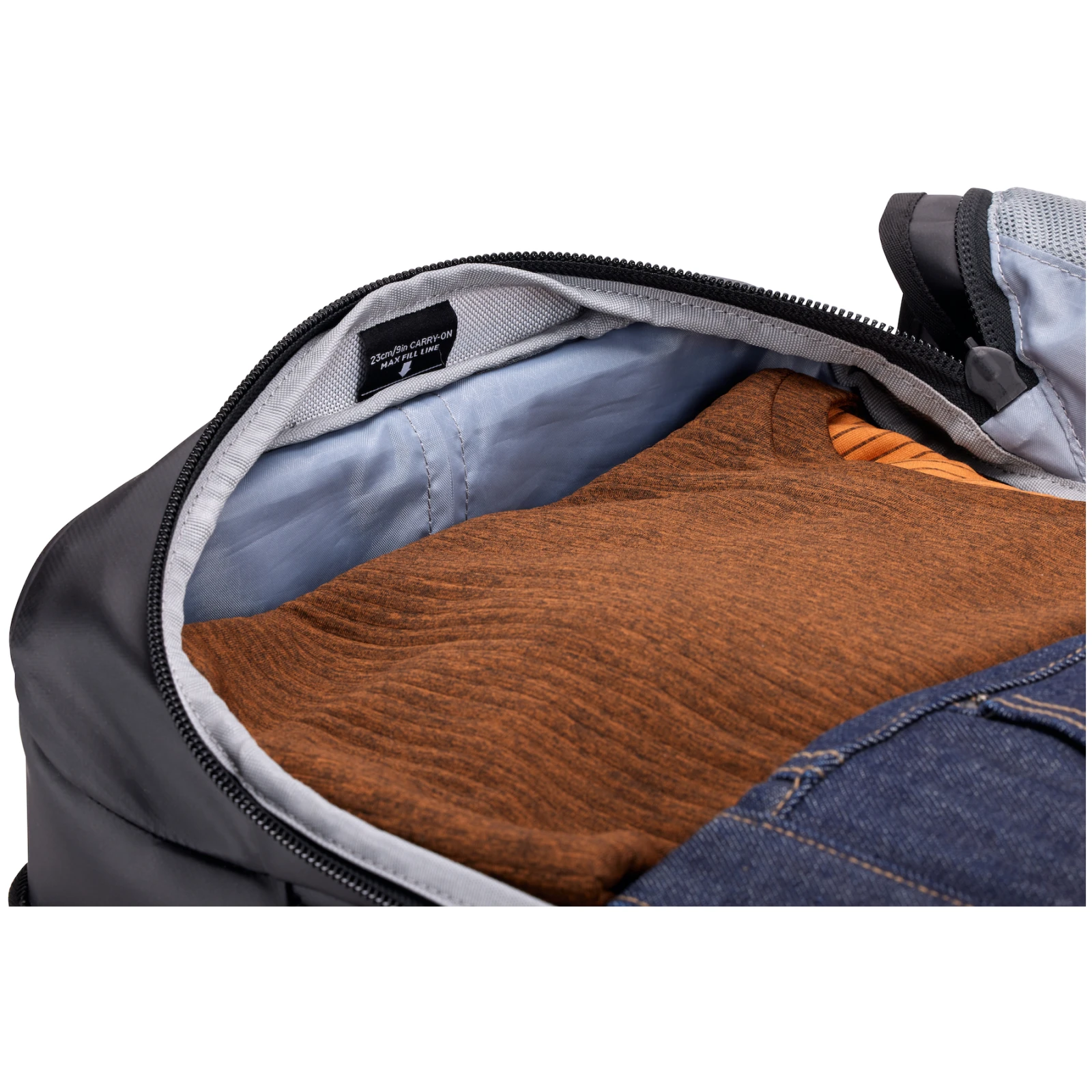 Im Hauptfach befindet sich außerdem ein Etikett, mit dessen Hilfe Sie feststellen können, ob Ihr Gepäck den Handgepäck-Größenbestimmungen der meisten Fluggesellschaften entspricht (55 x 23 x 35 cm). Wenn Sie beispielsweise mit dem Auto unterwegs sind, können Sie dieses Etikett ignorieren und zusätzlich 5 cm Stauraum nutzen.
