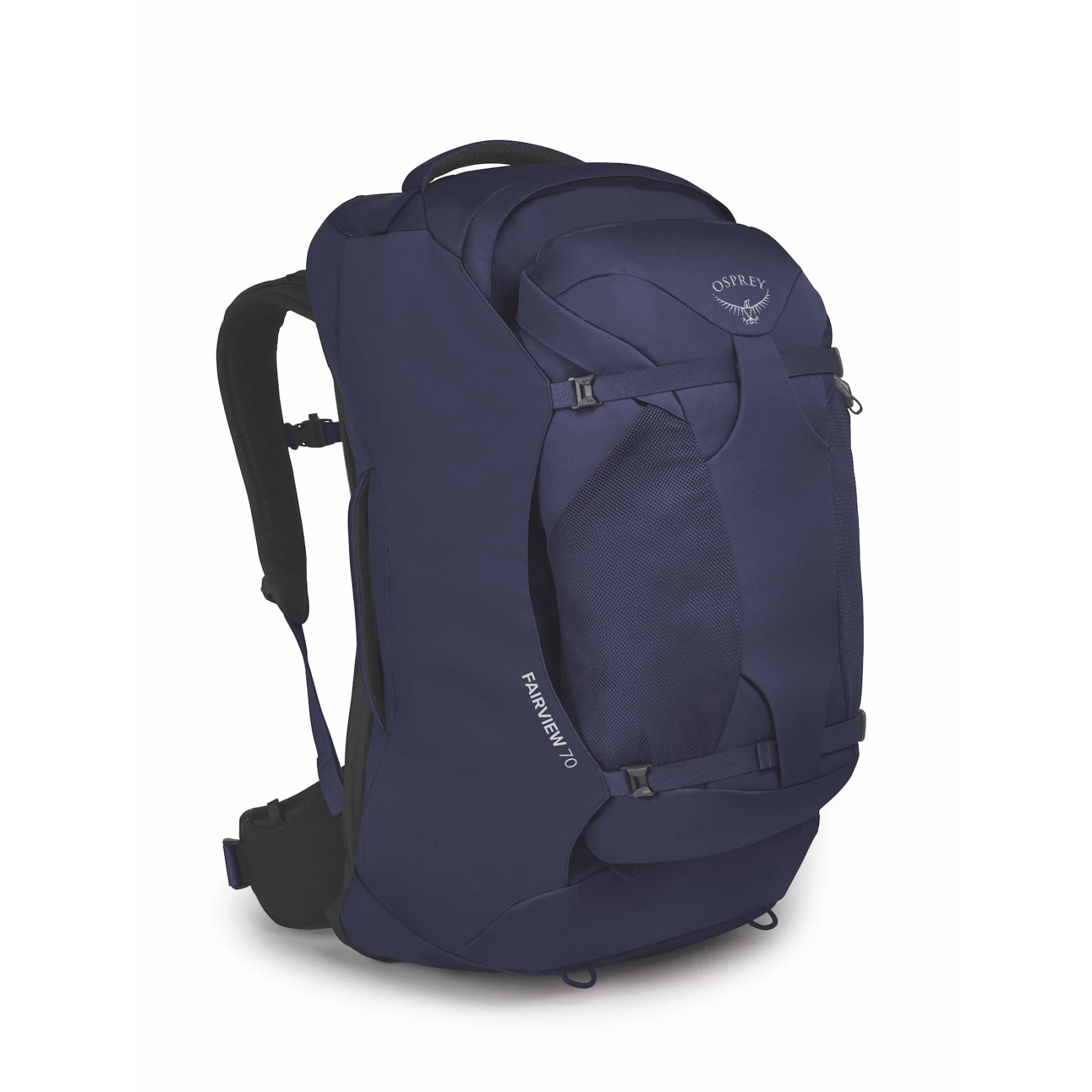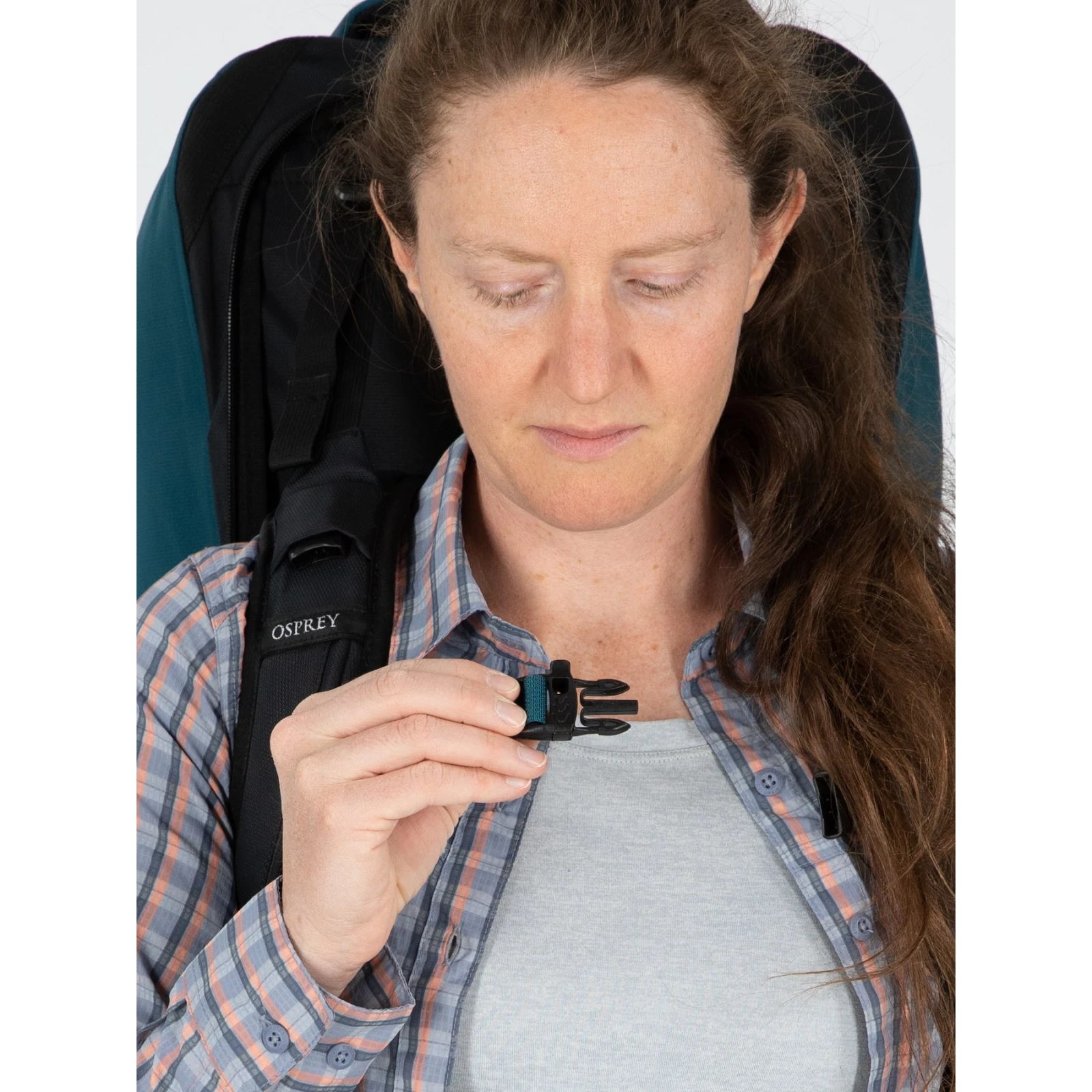 Die Damen Fairview 70 Tasche/Rucksack von Osprey ist ein einzigartiges Gepäckstück, das die Vorteile eines Koffers, einer Reisetasche und eines Rucksacks in einem vereint. Einzigartigen Tragekomfort bietet das AirScape™-Rückenteil, das mit Schaumstoffnoppen ausgestattet und in der Höhe verstellbar (38-47 cm) ist und somit bequem ist und eine optimale Passform bietet. Komplettiert wird das Panel dann noch durch bequeme und atmungsaktive Schultergurte, welche durch einen Brustgurt mit Pfeife und einen gepolsterten Hüftgurt mit Schnalle ergänzt werden. Für eine optimale Gewichtsverteilung beim Tragen sorgt ein Rahmen aus 4mm-Draht LightWire und einer Atilon-Rahmenplatte. Beim Check-In lässt sich das komplette Panel inklusive der Schultergurte verstauen, so dass keine Beschädigungsgefahr besteht.