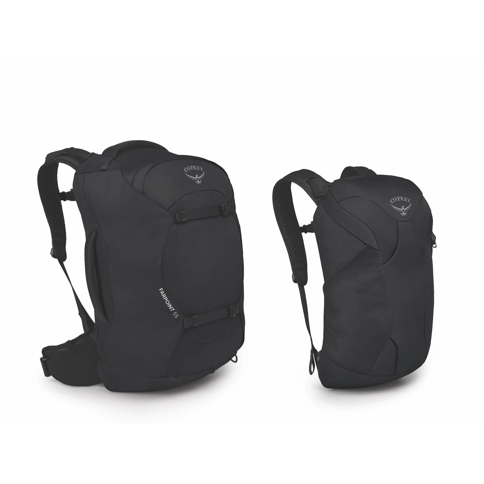 Der Rucksack besteht aus zwei Teilen, einem 40-Liter-Hauptrucksack und einem 15-Liter-Tagesrucksack Farpoint/Fairview Daypack, der an einem großen Rucksack befestigt oder separat getragen werden kann. Wenn Sie mit dem Flugzeug reisen, können Sie einen großen Rucksack im Gepäckfach über Ihnen und einen kleinen Rucksack unter dem Sitz verstauen.