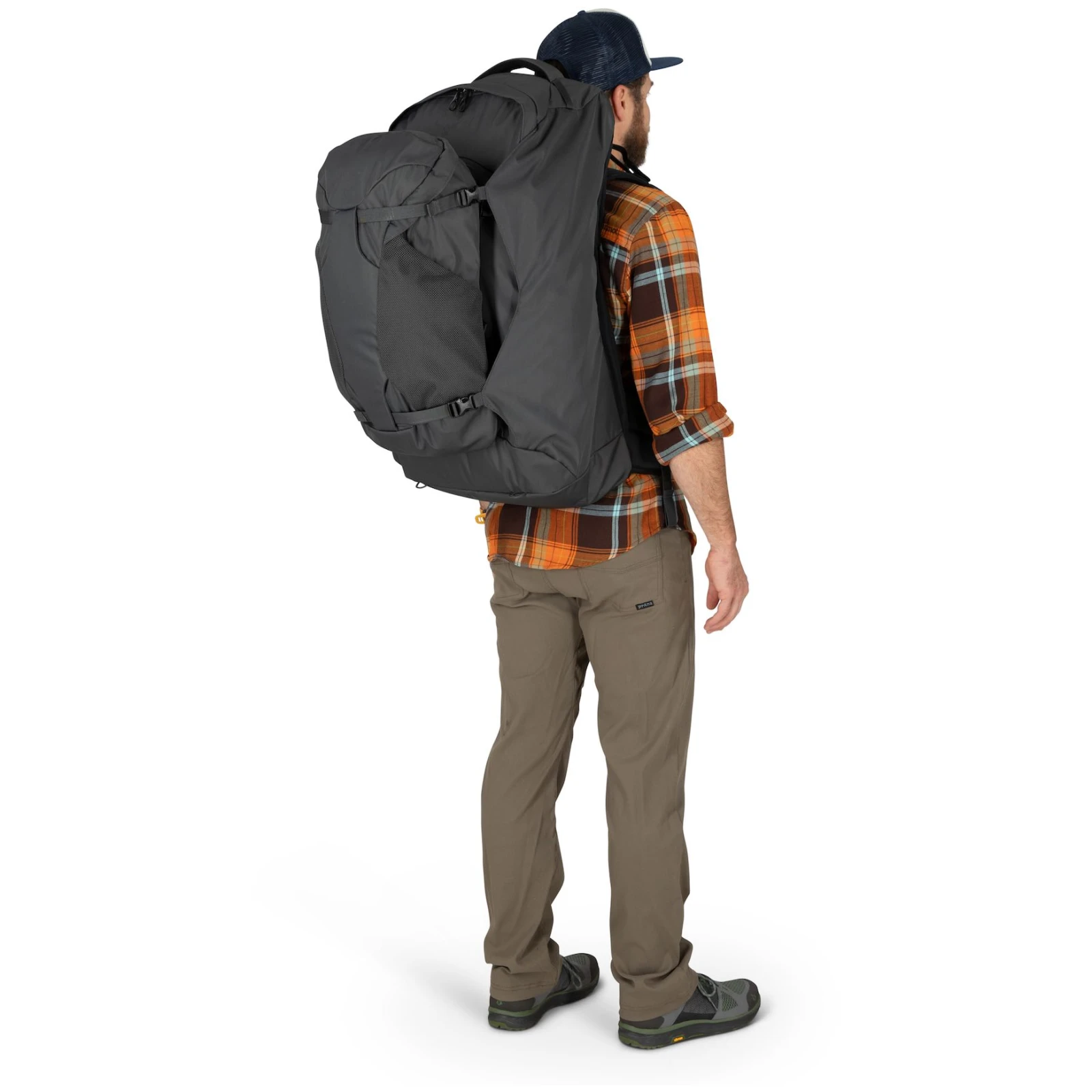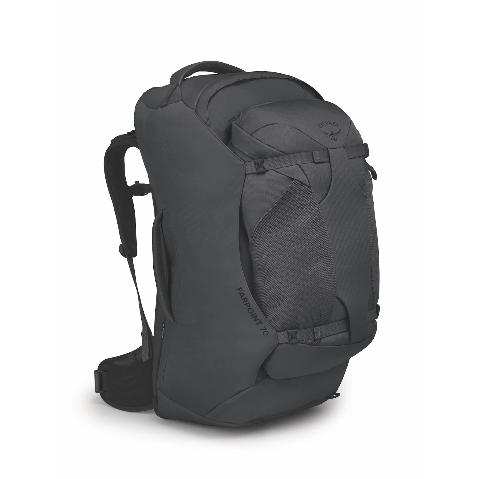 Der Rucksack besteht aus zwei Teilen, einem 55-Liter-Hauptrucksack und einem 15-Liter-Tagesrucksack Farpoint/Fairview Daypack, der an einem großen Rucksack befestigt oder separat getragen werden kann. Im Inneren des Rucksacks erwartet Sie die Aufteilung, die Sie an einem Koffer lieben: ein umlaufender Reißverschluss zum Öffnen der Vorderseite, interne Kompressionsriemen, eine große Netztasche und die Möglichkeit, die Reißverschlüsse zu verriegeln. Wie bei allen Rucksäcken findest du viele Taschen zum Verstauen von Kleinigkeiten und praktische Schlaufen zum Befestigen anderer Dinge. Der Daypack ist außerdem mit einem Laptop-/Trinkbeutelfach und elastischen Seitentaschen für eine Wasserflasche ausgestattet.