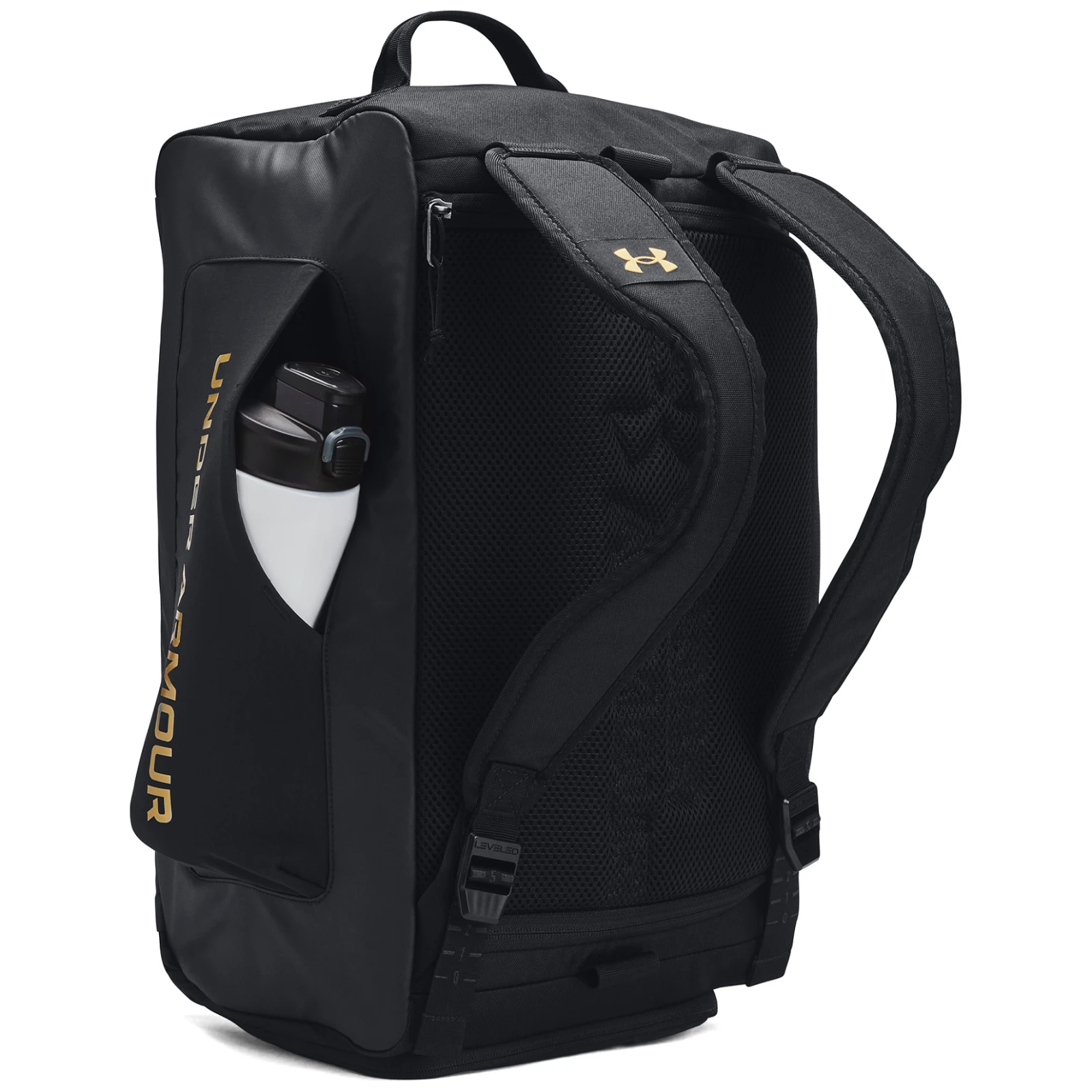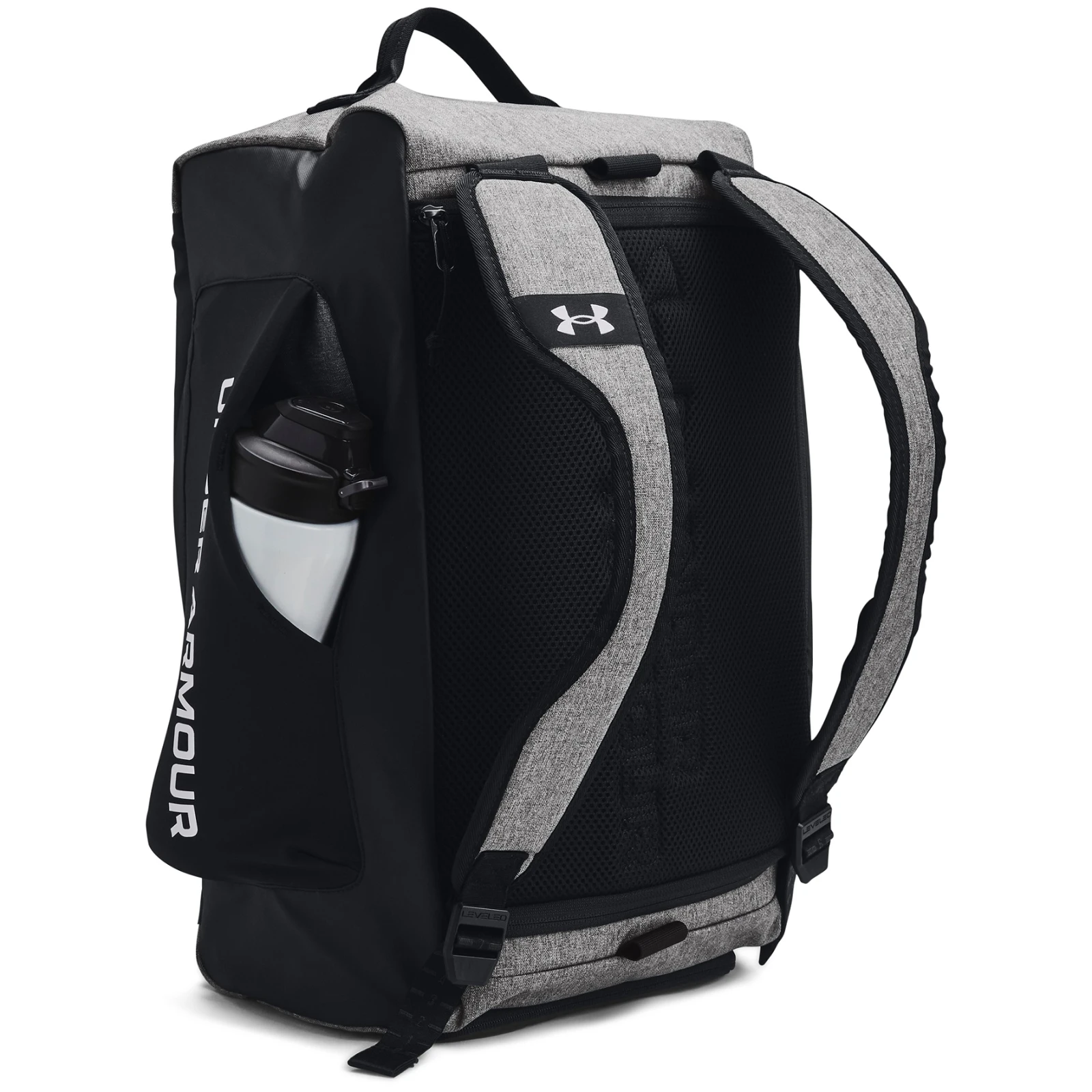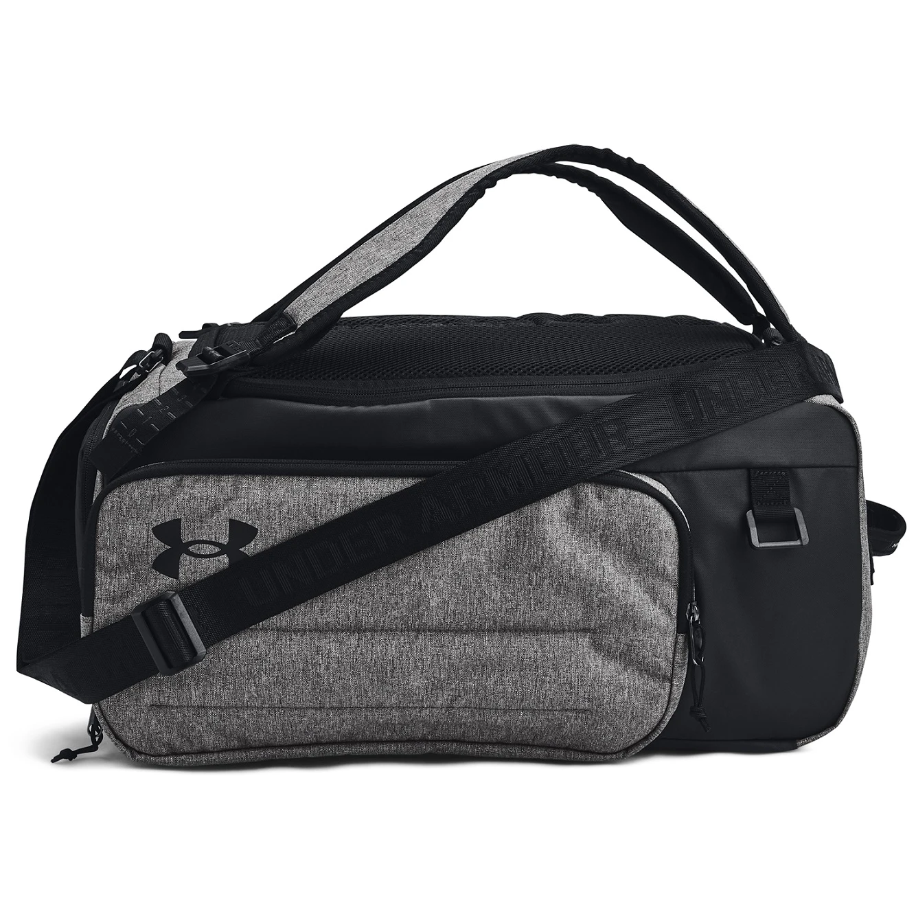 Die geräumige sportliche Umhängetasche Under Armour Modell Contain Duo SM BP Duffle aus Material Storm bietet Ihren Sachen Schutz vor Wasser. Der Boden und die Seiten bestehen aus extra strapazierfähigem Material gegen Abrieb. Die Tasche ist aufgeteilt in große atmungsaktive Tasche für Kleidung oder Schuhe und zusätzliche Innentaschen für eine einfachere Organisation. Bequeme Tragegriffe und ein langer verstellbarer Schultergurt erleichtern die Handhabung und den Transport. Zudem lässt sich die Tasche in einen Rucksack verwandeln, der sich bequem an zwei Schultergurten tragen lässt.