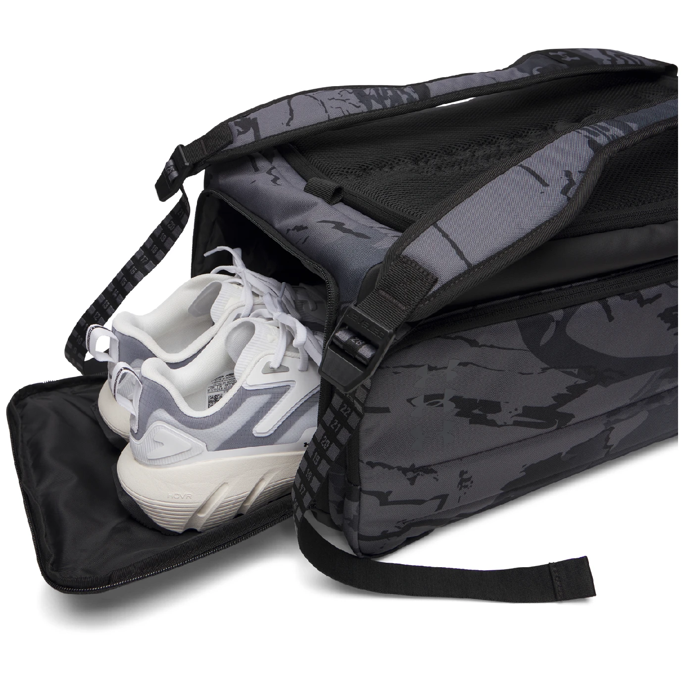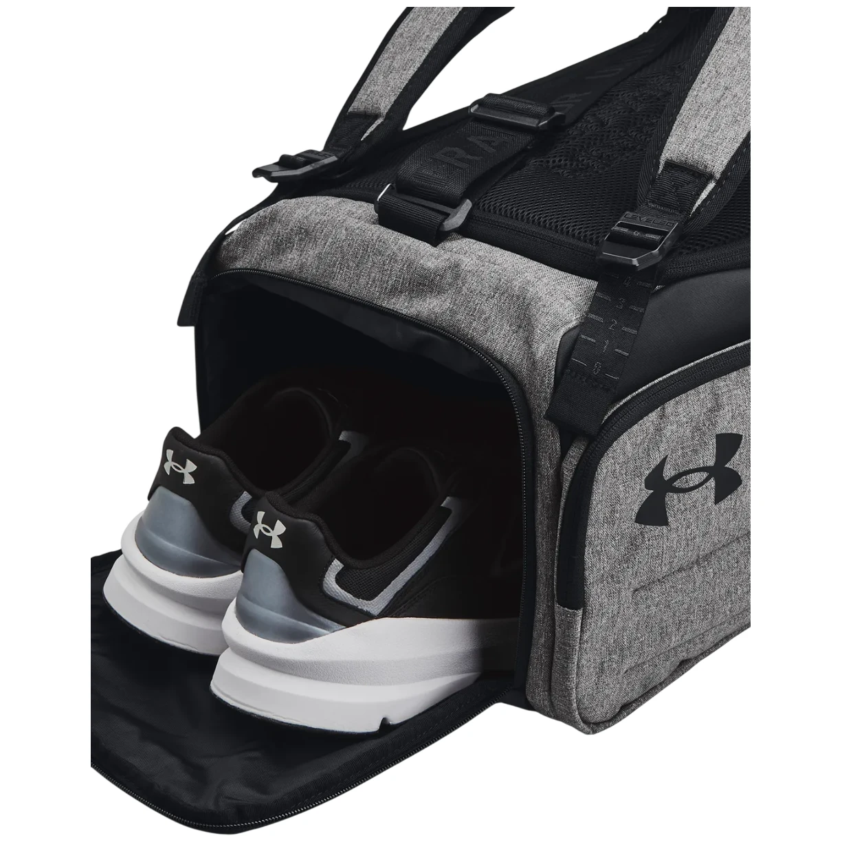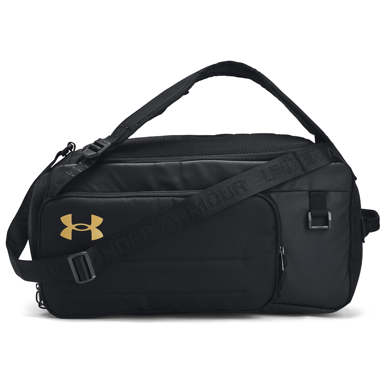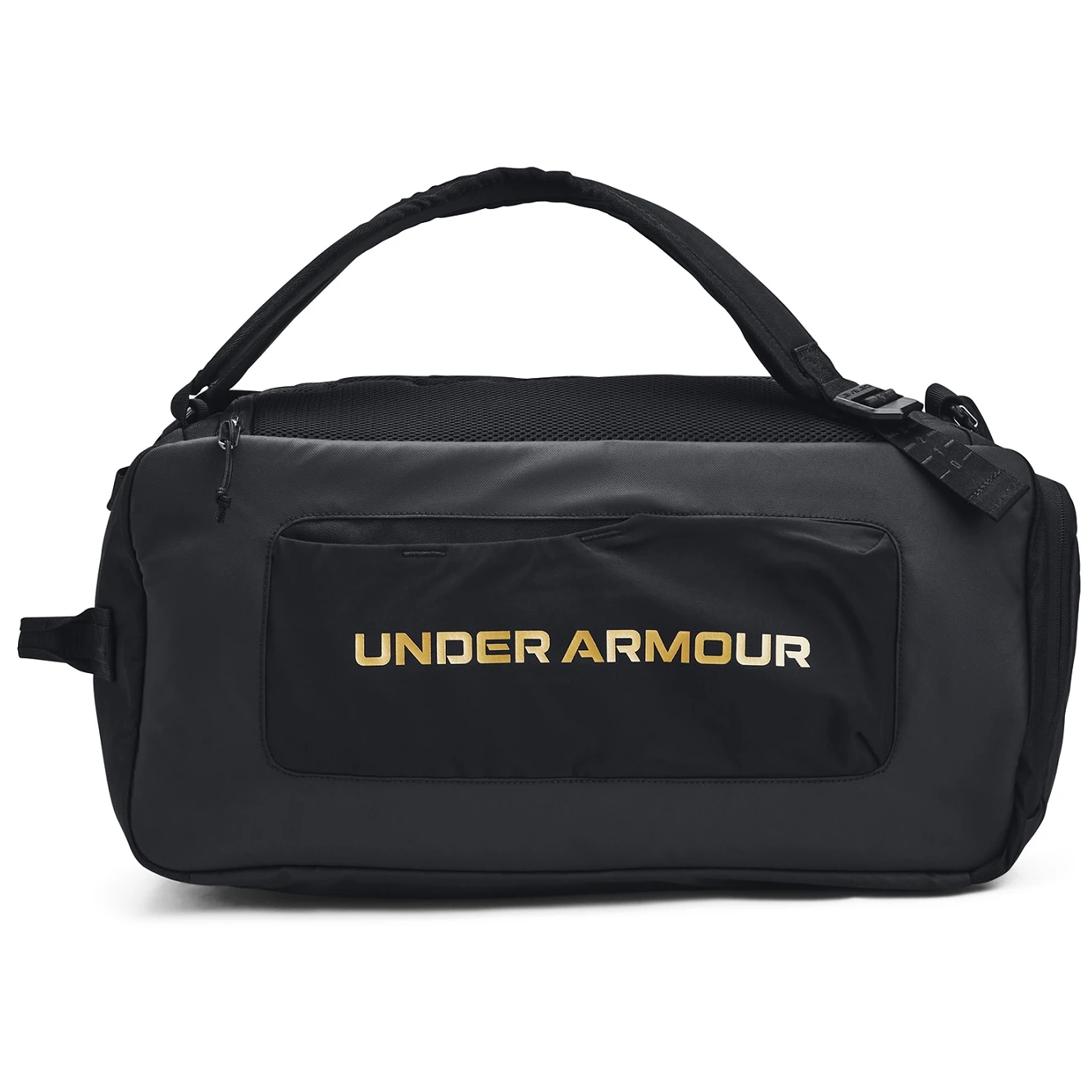 Die geräumige sportliche Umhängetasche Under Armour Modell Contain Duo SM BP Duffle aus Material Storm bietet Ihren Sachen Schutz vor Wasser. Der Boden und die Seiten bestehen aus extra strapazierfähigem Material gegen Abrieb. Die Tasche ist aufgeteilt in große atmungsaktive Tasche für Kleidung oder Schuhe und zusätzliche Innentaschen für eine einfachere Organisation. Bequeme Tragegriffe und ein langer verstellbarer Schultergurt erleichtern die Handhabung und den Transport. Zudem lässt sich die Tasche in einen Rucksack verwandeln, der sich bequem an zwei Schultergurten tragen lässt.