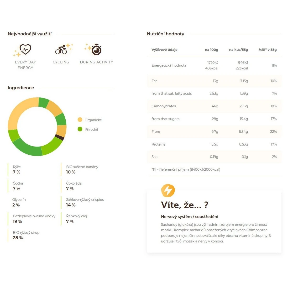 Der tschechischer Hersteller Chimpanzee mit Sitz in Brünn stellt rein natürliche Energieriegel und Getränke her. Die Produkte von Chimpanzee werden nur aus den hochwertigsten, rein natürlichen Zutaten hergestellt und erfüllen die anspruchsvollsten Anforderungen an einen aktiven und gesunden Lebensstil. Kosten Sie, lassen Sie sich von der natürlichen Energie mitreißen und vor allem - sagen Sie der Chemie Lebewohl.