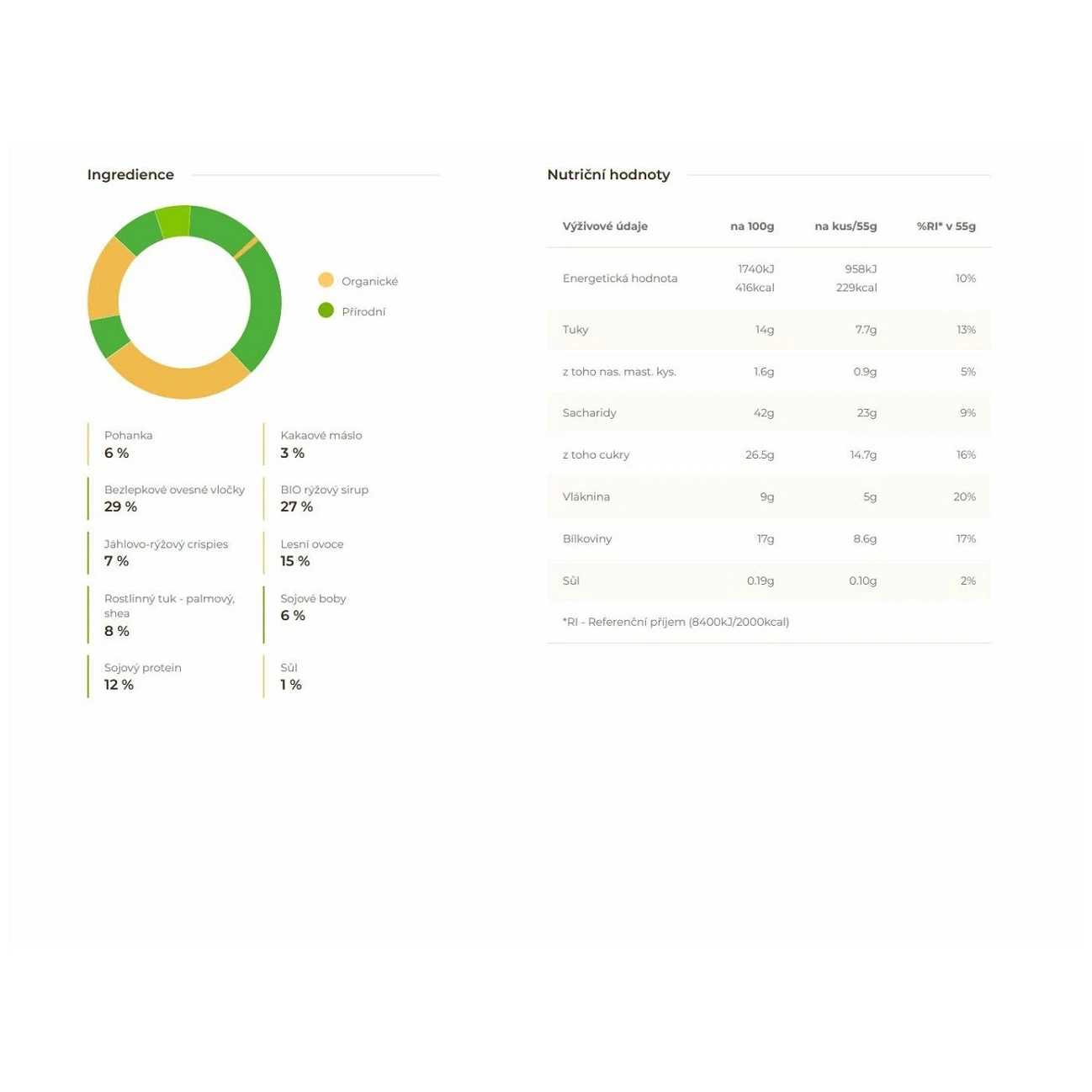 glutenfreie Haferflocken, Reissirup, Pflanzenfett (Palm, Shea), Sojaeiweiß, Buchweizen, Sojamehl, Hirse-Reis-Extrudat, Heidelbeerpaste 4%, Feuchthaltemittel: Glycerin, schwarze Johannisbeere, Heidelbeerpulver 2%, Kartoffelfasern, Kakaobutter, natürliches Aroma, Salz.