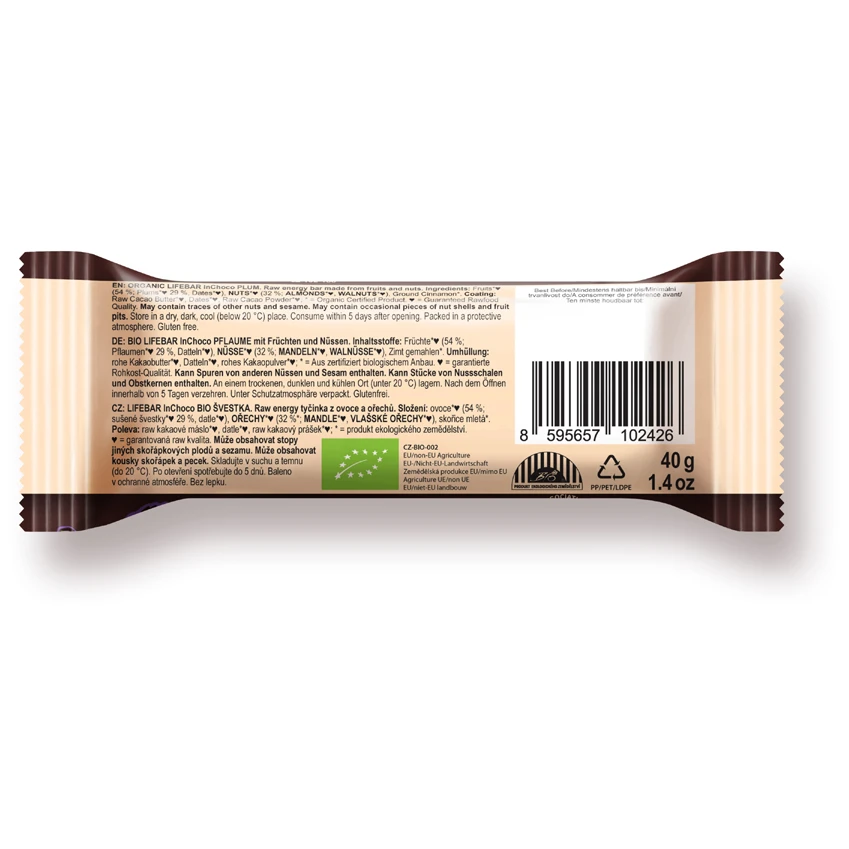 Pflaume RAW BIO 40 g ist eine geniale Kombination aus Pflaumen mit Zimt und Walnüssen, jetzt in einem köstlichen RAW-Schokoladenüberzug.