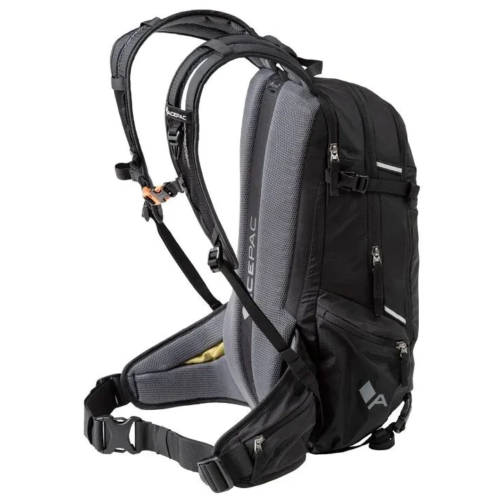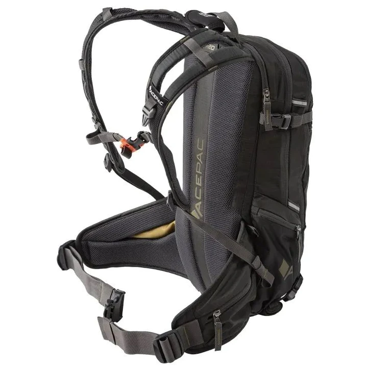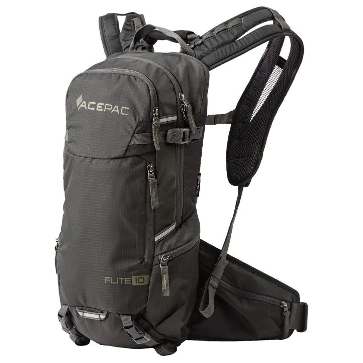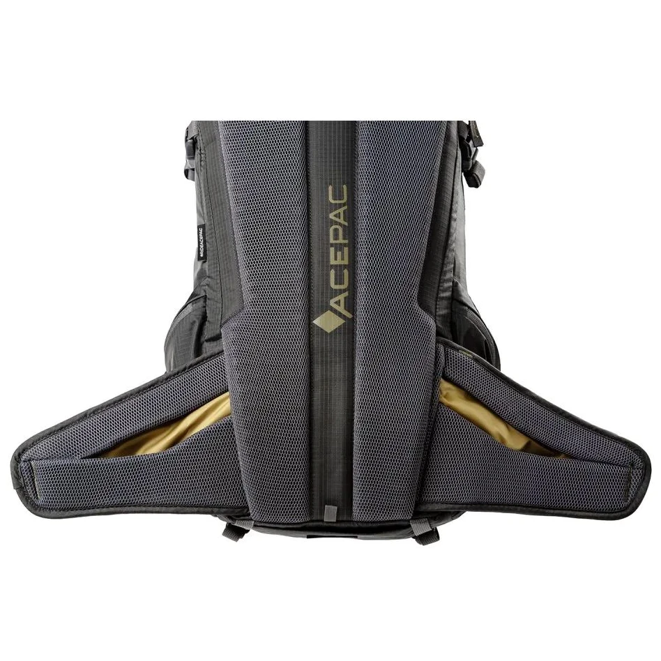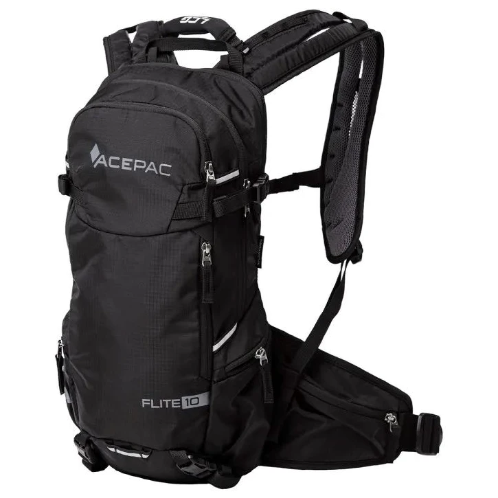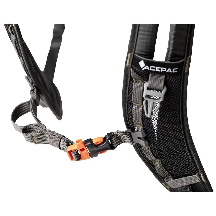 Der Flite 10 MKIII-Rucksack von Acepac verfügt über Taschen am Hüftgurt für kleine Gegenstände, die Sie beim Gehen oder Radfahren schnell greifen möchten. Das Hauptfach des Rucksacks verfügt über eine Tasche, die in erster Linie für einen Rückenprotektor vorgesehen ist, jedoch auch als zusätzlicher Stauraum genutzt werden kann. Der Rucksack verfügt über ein Handgepäck-Gurtsystem, das mit der Acepac Bar Bag oder Bar Drybag 8 L kompatibel ist. Diese Taschen können Sie problemlos am Rucksack befestigen.