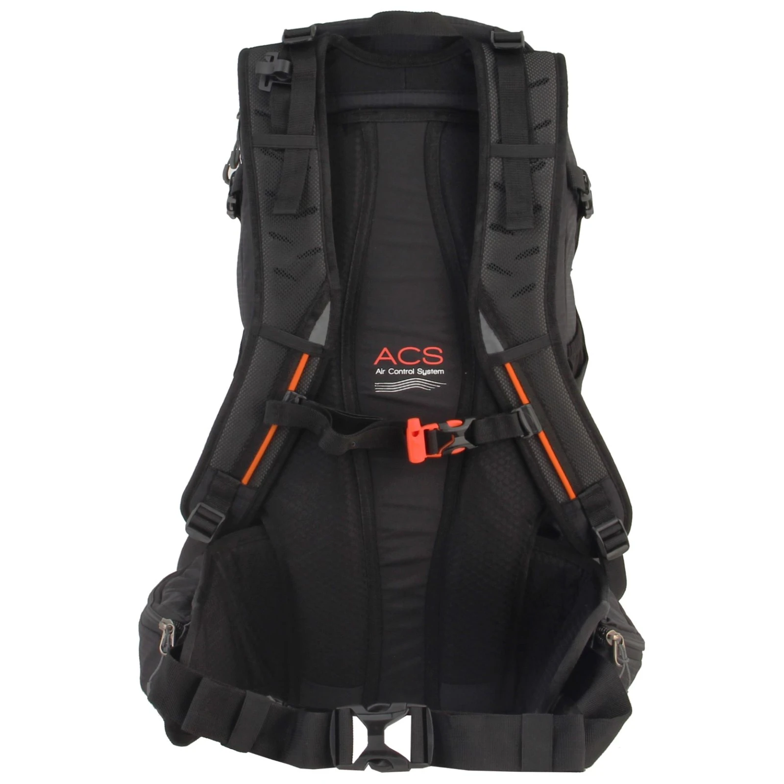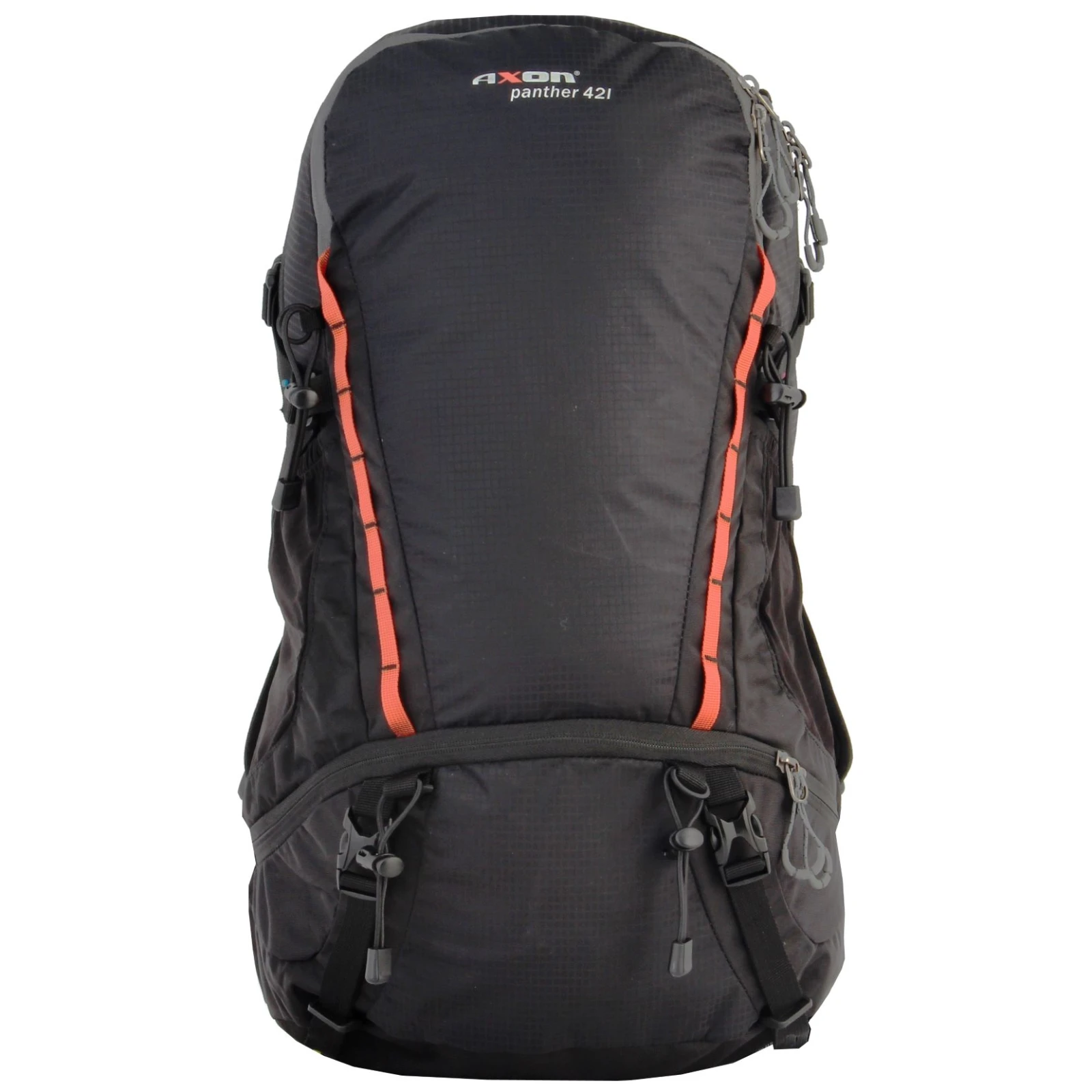 Der Panther-Rucksack der tschechischen Marke Axon hat einen belüfteten gepolsterten ACS-Rücken. Schultergurte mit Balance-Schulterelementen mit verstärkter Polsterung sind anatomisch geformt und verfügen über einen höhenverstellbaren Brustgurt mit Signalpfeife. Ein gepolsterter Hüftgurt mit Reißverschlusstaschen und seitliche Kompressionsriemen sorgen für einen festen und bequemen Sitz des Rucksacks auf Ihrem Rücken. Der Hüftgurt lässt sich im unteren Teil des Rückensystems verstecken. Das große Hauptfach verfügt zusätzlich über einen zweiteilbaren Bodeneingang mit Innentasche für eine Trinkblase. Der Rucksack hat eine tiefe Fronttasche mit Reißverschluss und Organizer sowie zwei Seitentaschen aus elastischem Stoff. Nutzen Sie hierfür zB. Trekkingstockhalter inkl. unterer Befestigungsgurte. auf einer Isomatte. Es eignet sich sowohl für kürzere als auch anspruchsvollere Wanderungen.