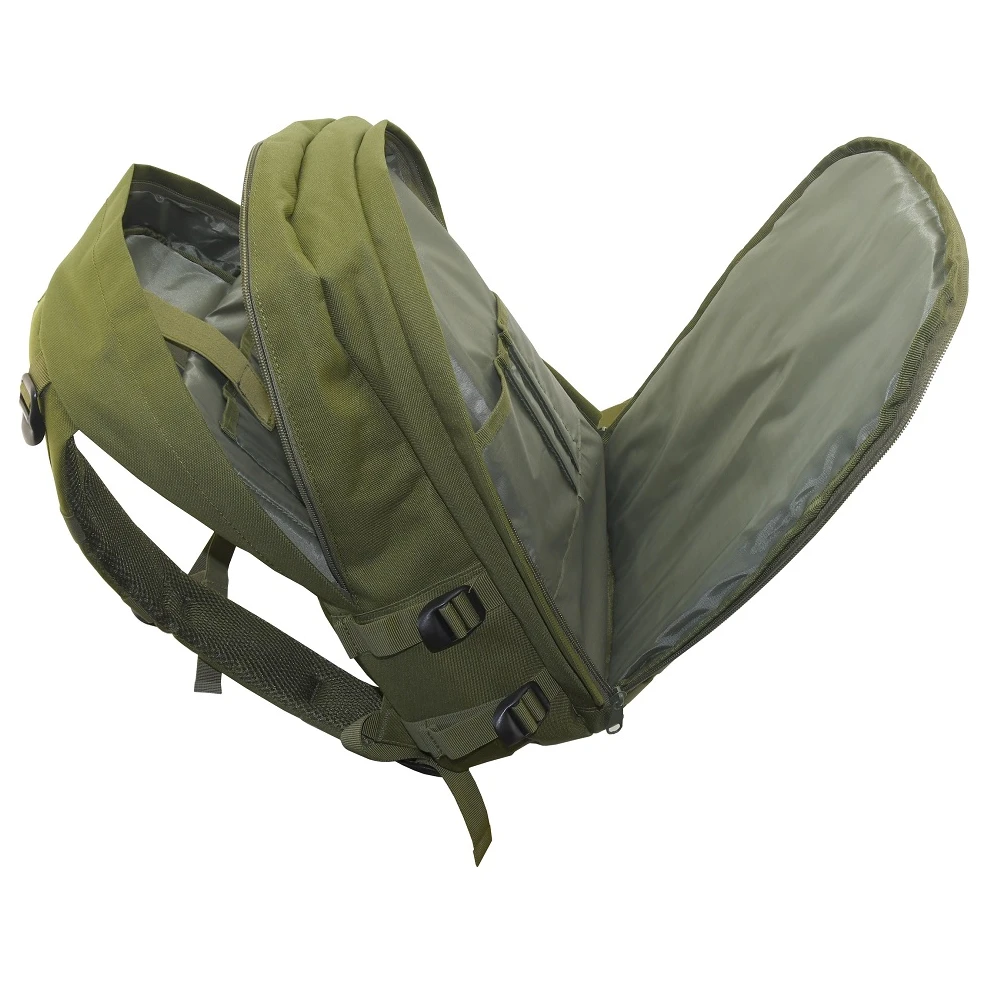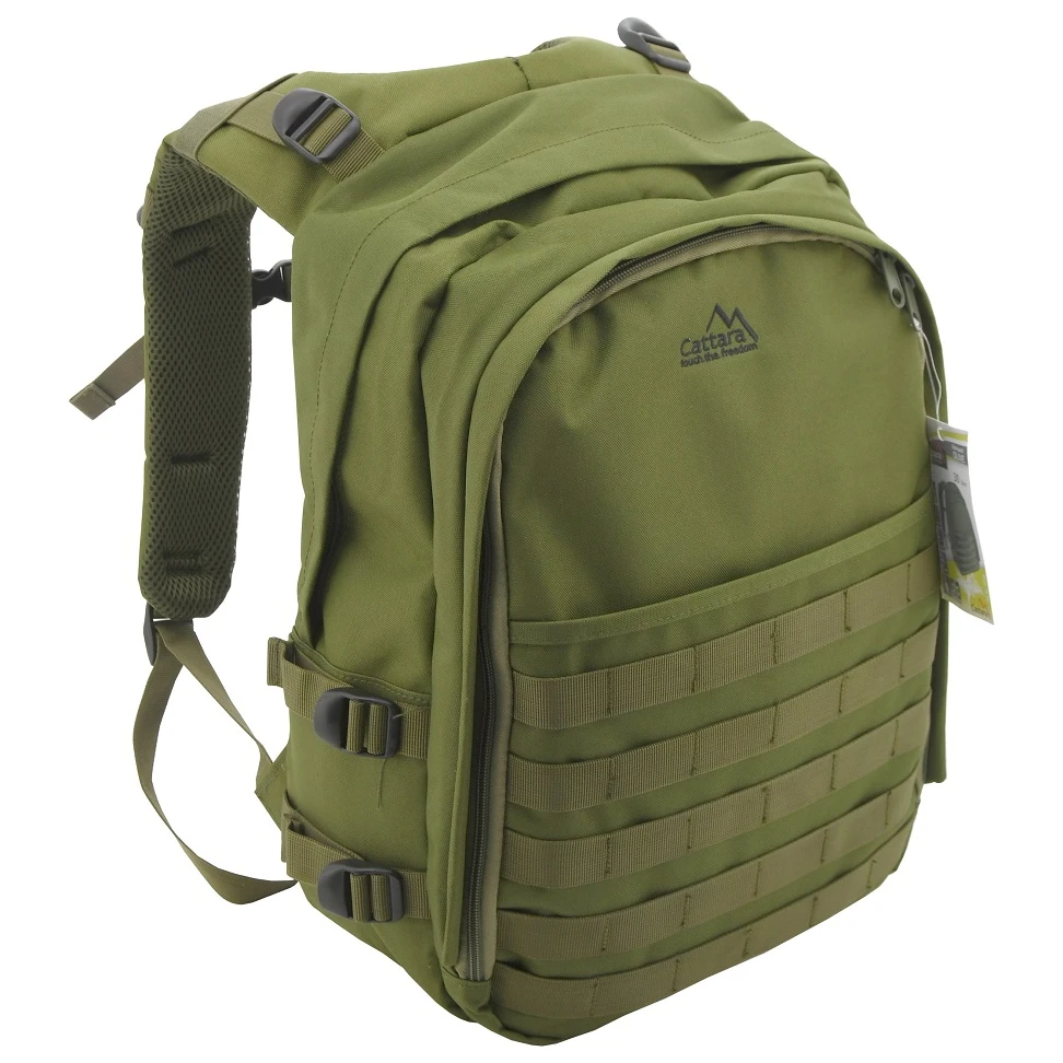 Rucksack Cattara Olive 30 l ist die ideale Wahl für jeden Ausflug tief in den Wald, aber sein schlichtes Design wird auch überall sonst geschätzt. Zwei Hauptfächer mit mehreren Innentaschen bieten ausreichend Platz, um alles Wichtige zu verstauen. Bekanntes Molle-System zur Anbringung von Zusatzausrüstung und Taschen. Die Taschen sind mit langlebigen Zwei-Wege-Reißverschlüssen ausgestattet. Zum Tragekomfort tragen verstellbare Träger, ein Brustgurt, eine gepolsterte Rückenpartie und Kompressionsriemen bei. Der Rucksack besteht aus 100 % Polyester mit einer wasserdichten PVC-Schicht.