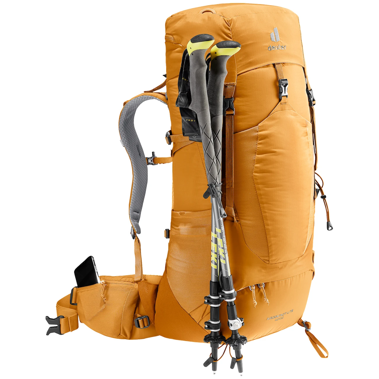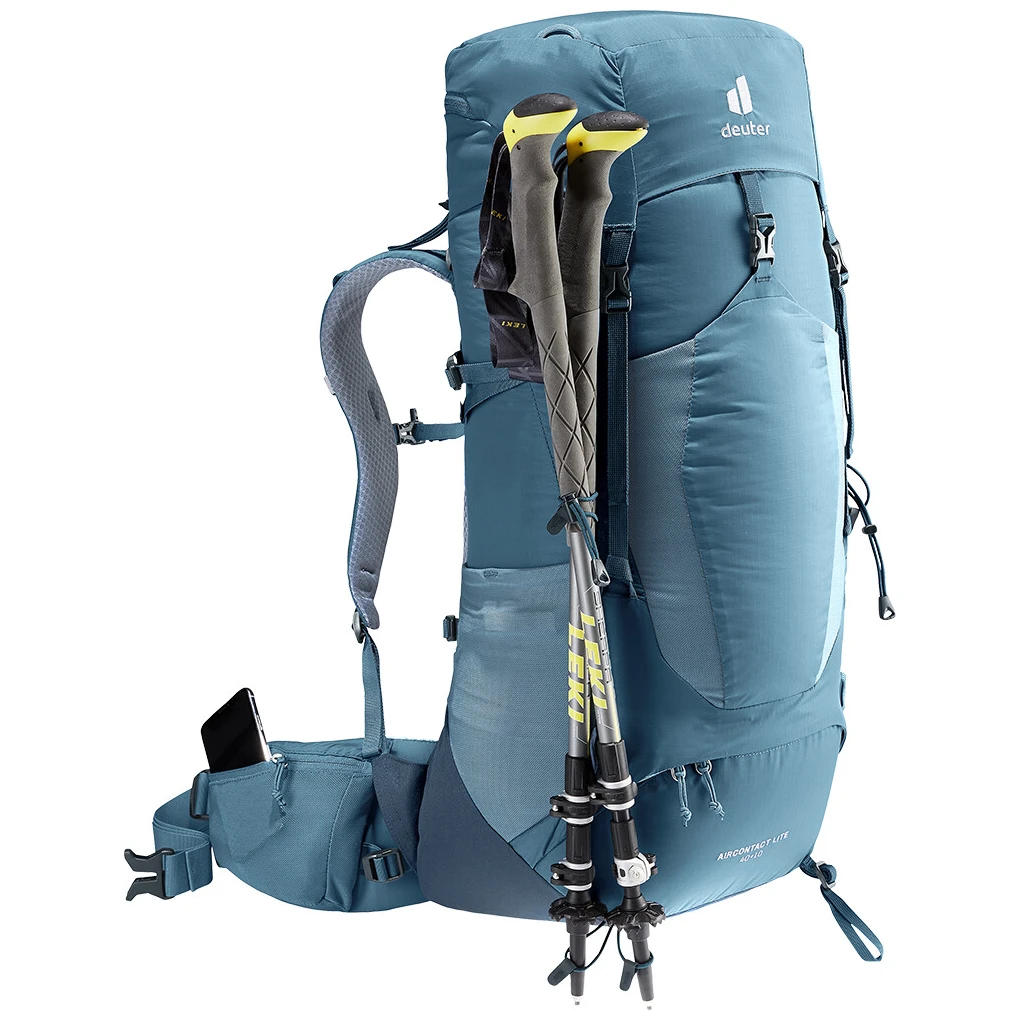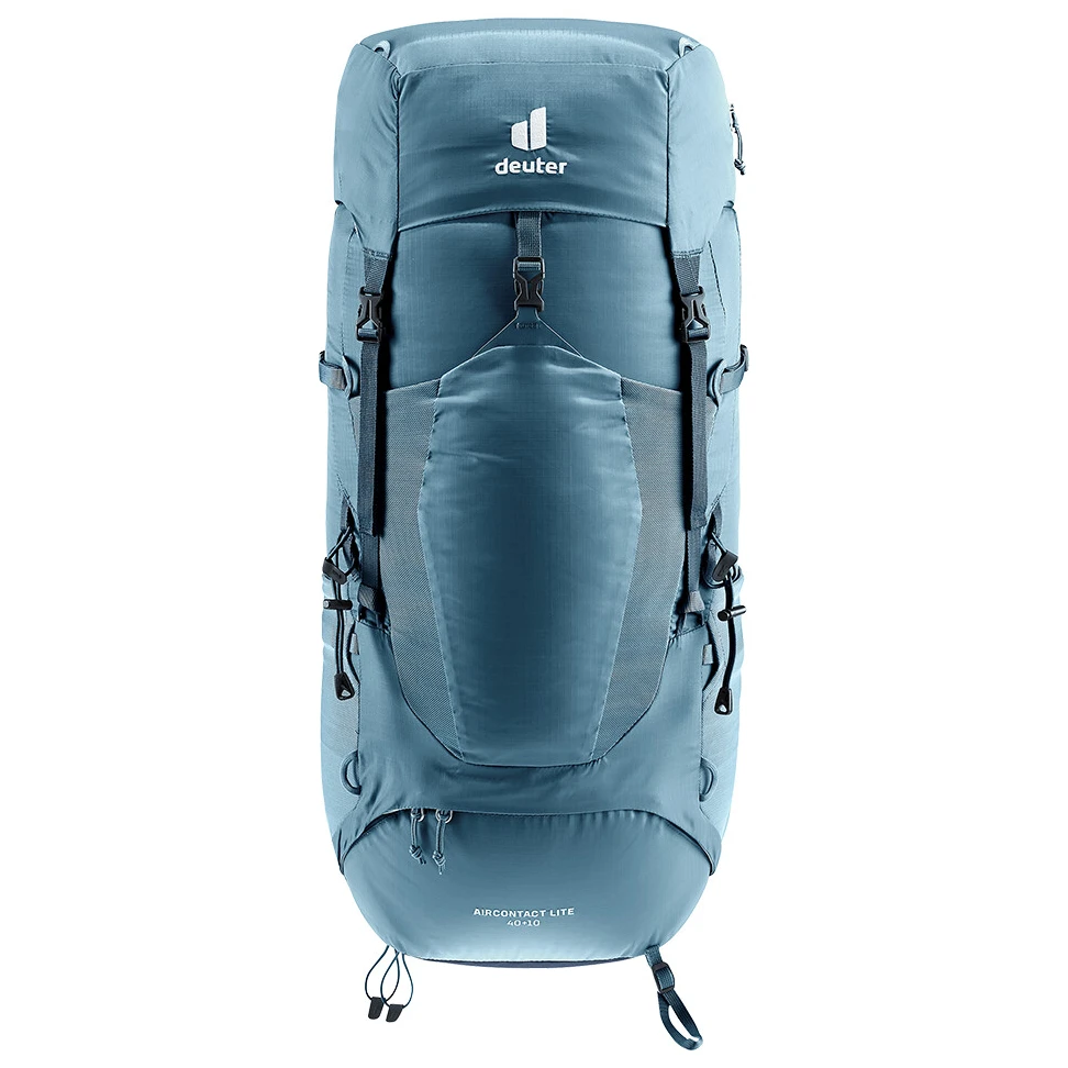 Leichter Premium-Rucksack Deuter Aircontact Lite 40 + 10 für lange Strecken. Hierzu zählen ein belüftetes Rückensystem, eine verstellbare Rückenlänge und/oder ein abnehmbarer Deckel, der den Rucksack als separaten kleinen Rucksack oder Tasche nutzt.