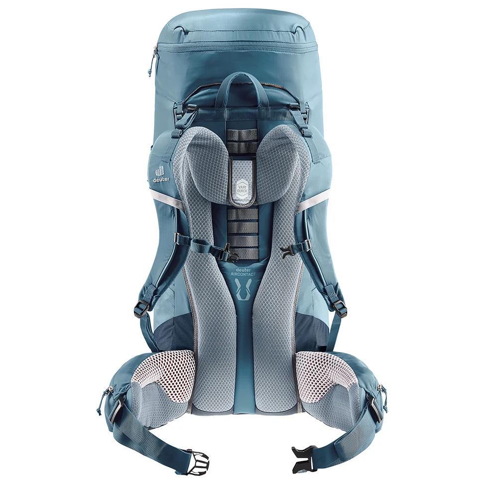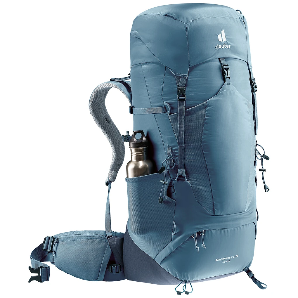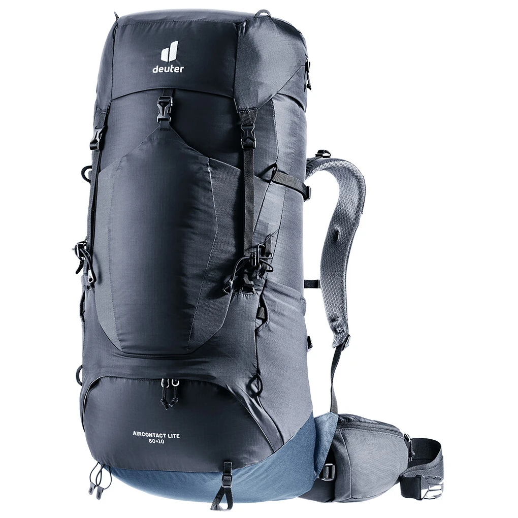 Leichter Premium-Rucksack Deuter Aircontact Lite 50 + 10 für lange Strecken. Hierzu zählen ein belüftetes Rückensystem, eine verstellbare Rückenlänge und/oder ein abnehmbarer Deckel, der den Rucksack als separaten kleinen Rucksack oder Tasche nutzt.