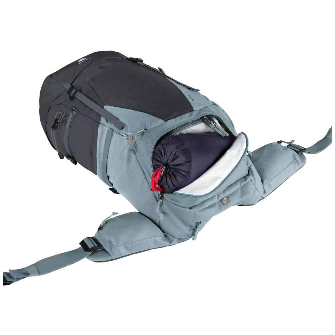 Der Rucksack besteht aus recycelten Materialien und leichtem, reißfestem Polyestergarn. Zur besseren Positionierung gibt es einen verstellbaren und ergonomisch geformten Lenden- und Brustgurt sowie eine Polsterung im Wirbelsäulenbereich. Der Rucksack bietet außerdem eine Fronttasche aus Stretch-Mesh, die Sie zum Belüften nasser Kleidung auf Reisen zu schätzen wissen werden. Der Rucksack ist mit einer Regenhülle für schlechtes Wetter, Stockschlaufen, einer Tasche für Wertsachen und einer Tasche für eine 3-Liter-Trinkblase ausgestattet.