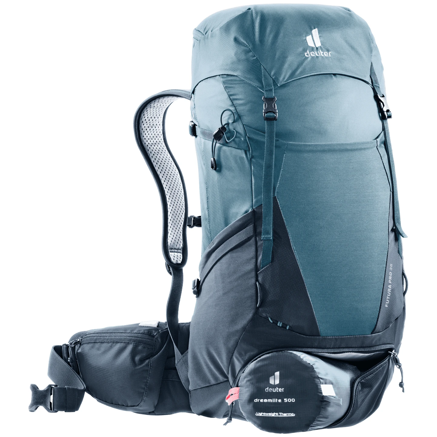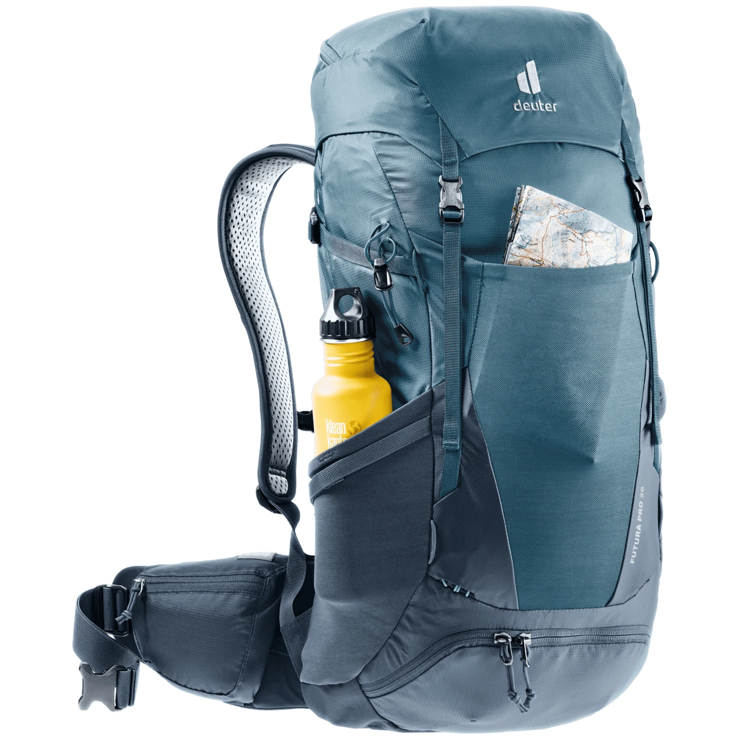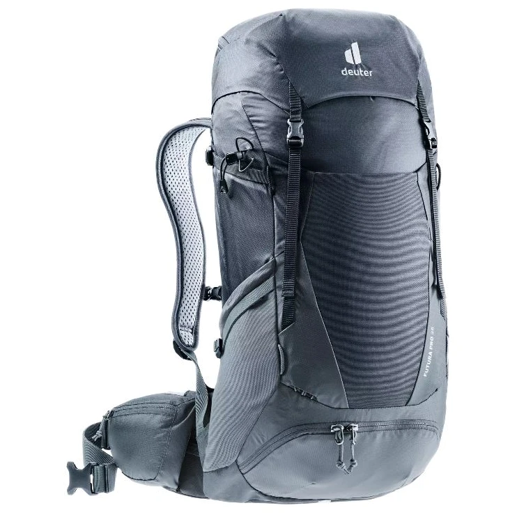 Der Wanderrucksack Futura Pro 36 der Marke Deuter ist mit durchdachten Details auf Komfort für unterwegs ausgelegt. Der Rucksack besteht aus Recyclingmaterial mit leichtem Polyestergarn, das so stark ist, dass es nicht reißt. Der Rucksack verfügt daher über ein ergonomisches Mesh-Aircomfort-Sensic-Pro-Rückensystem, das eine maximale Rückenbelüftung gewährleistet. Die beweglichen Lordosenflossen VariFlex ECL mit ergonomischen Polstereinsätzen ermöglichen zusätzlich ein kraftsparendes Tragen.