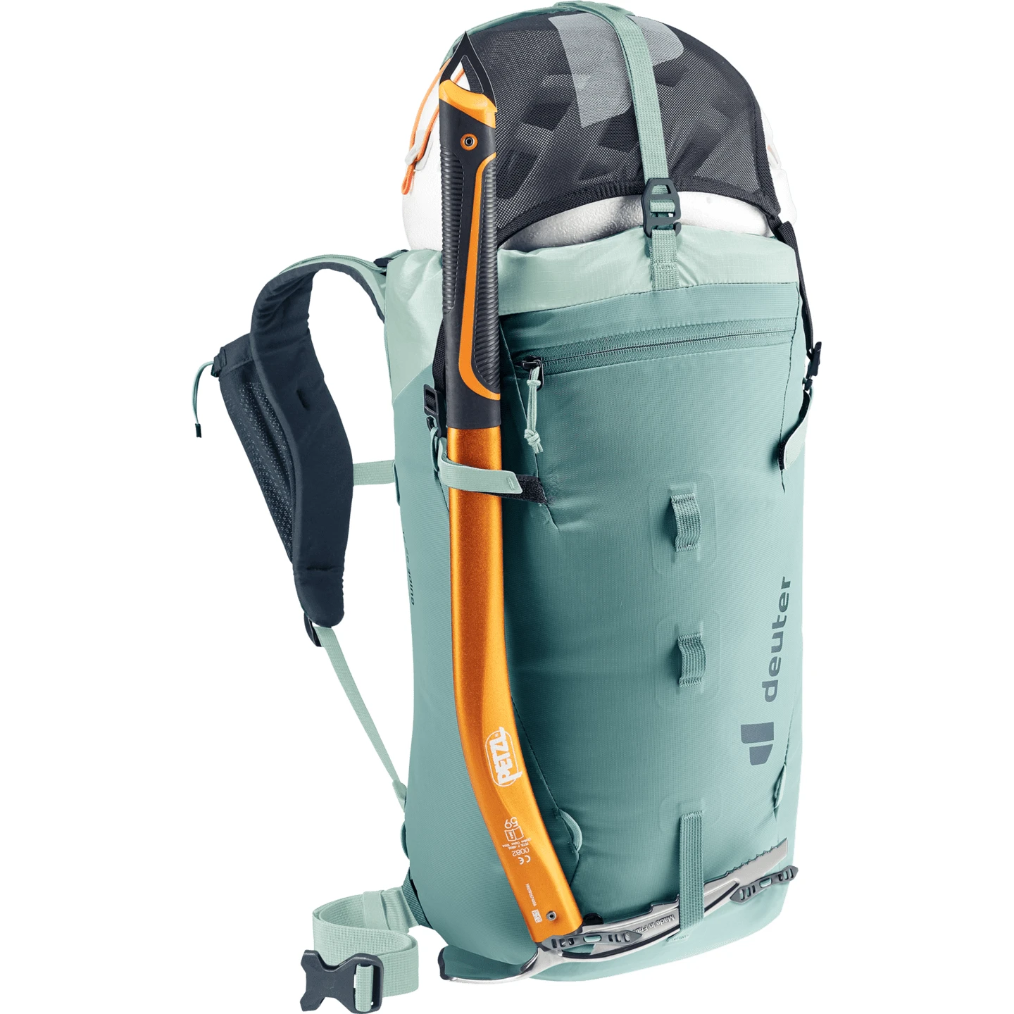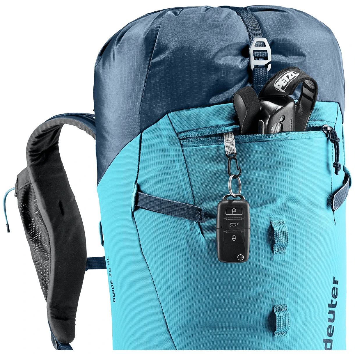 Leichter klimaneutraler und PFC-freier Kletterrucksack Deuter Guide 22 SL aus langlebigem Material. Hier finden wir verbesserte Eispickel- und Helmbefestigungssysteme und ein kompaktes Seilband. Das neue Deckeldesign ermöglicht schnellen Zugriff auf die Hauptkammer. Und im Deckel ist ein abnehmbarer Helmhalter aus Netzmaterialintegriert, der auch an die Vorderseite des Rucksacks angebracht werden kann. Am Schultergurt finden wir eine Tasche für eventuelle Kleinigkeiten.