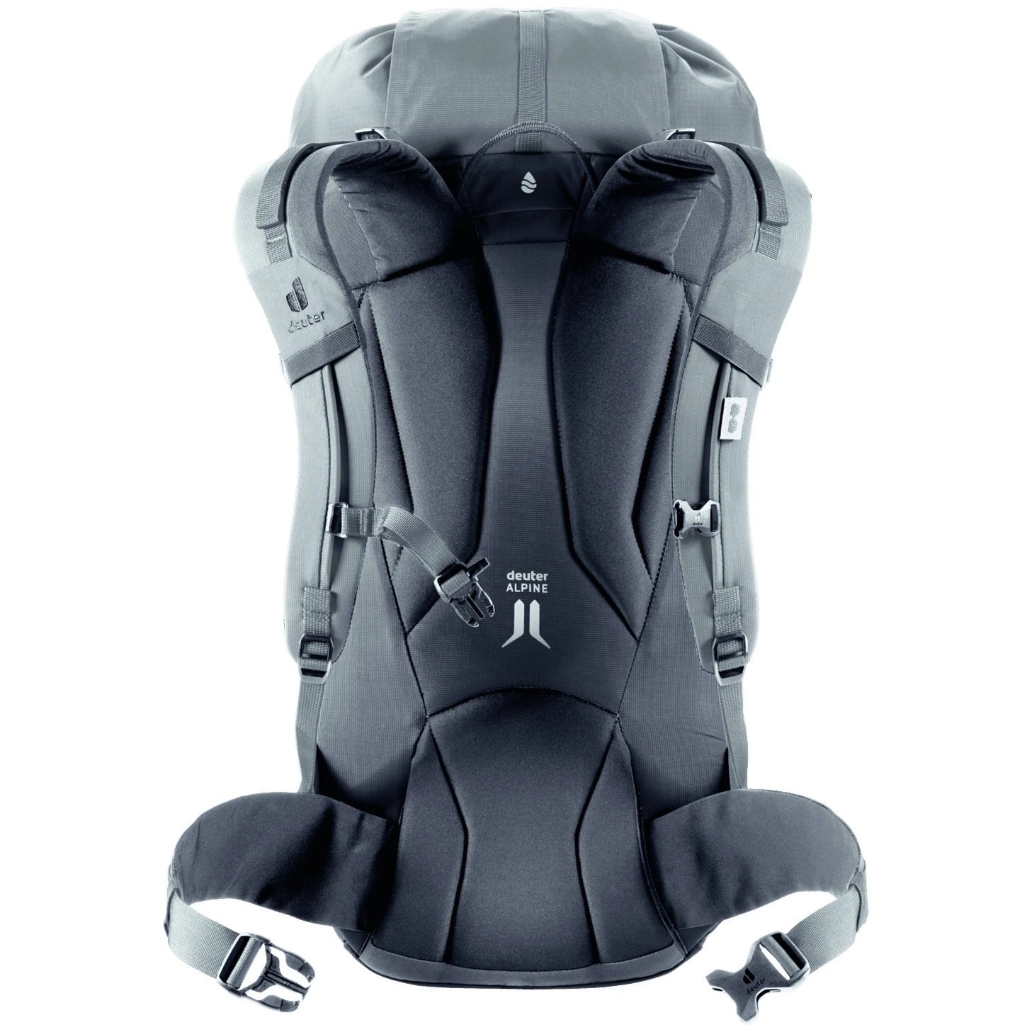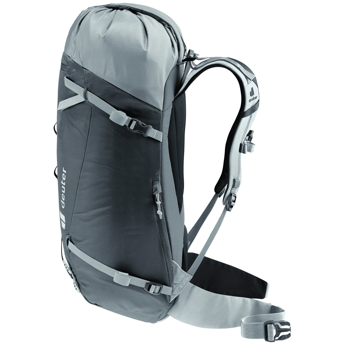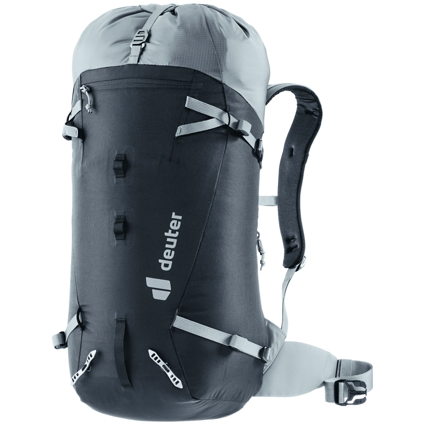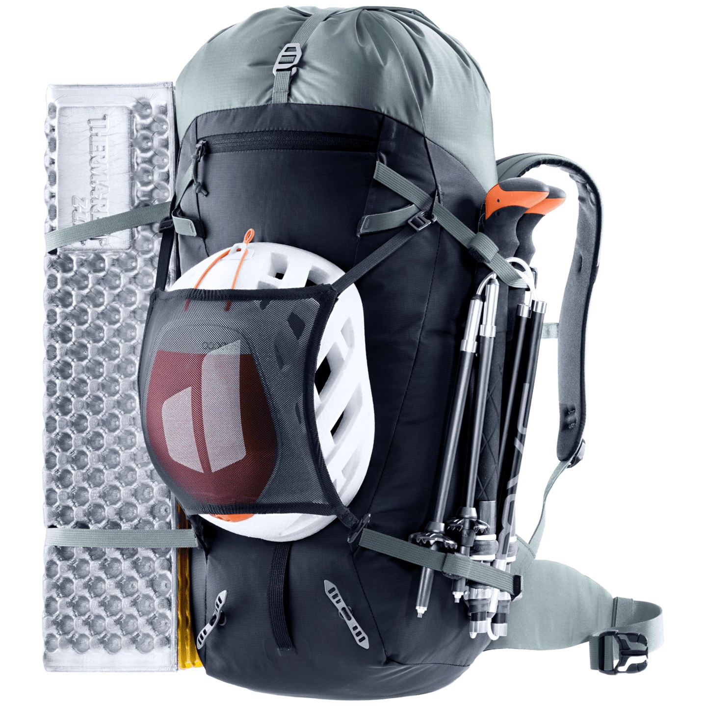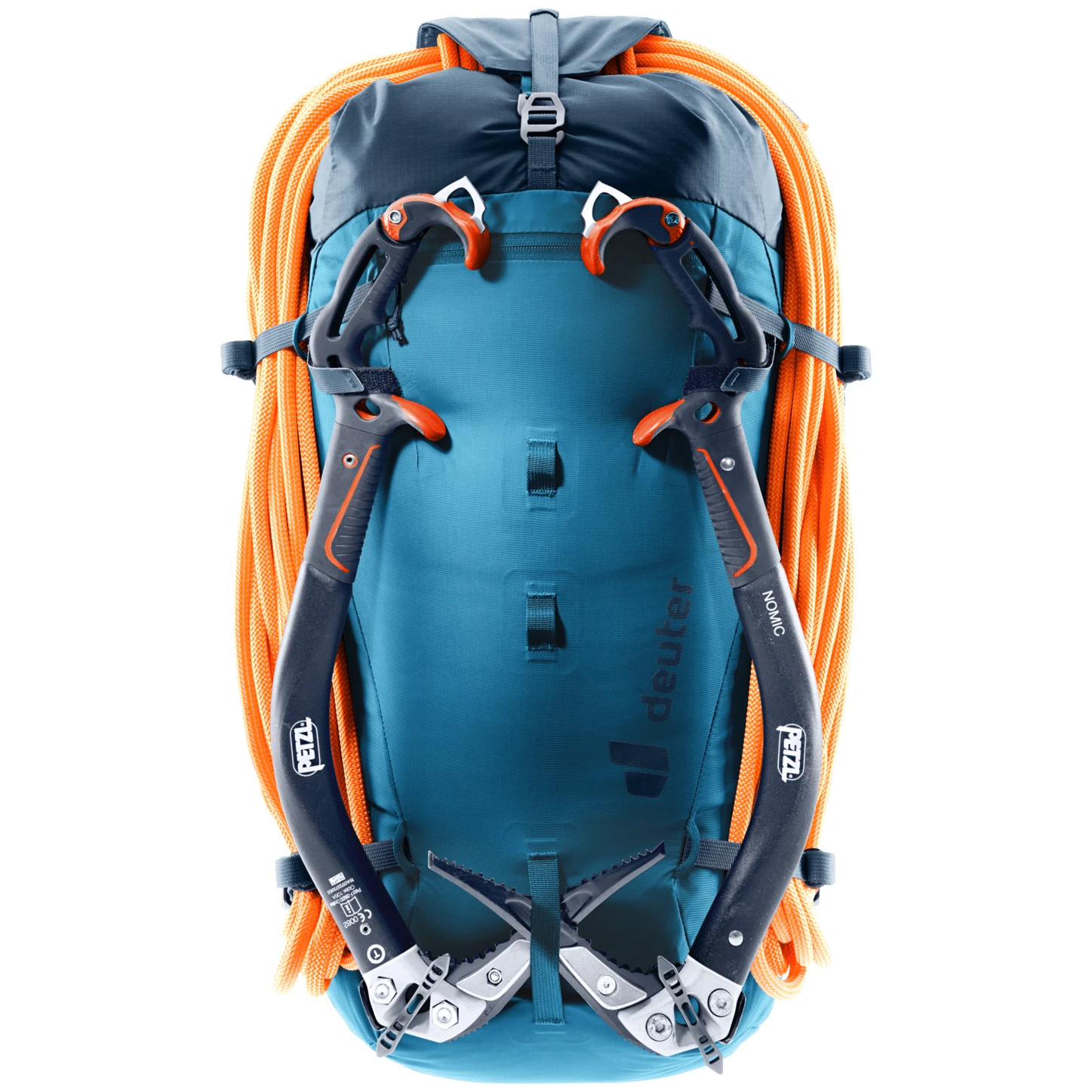 Leichter klimaneutraler und PFC-freier Kletterrucksack Deuter Guide 30 aus langlebigem Material. Hier finden wir verbesserte Eispickel- und Helmbefestigungssysteme und ein kompaktes Seilband. Das neue Deckeldesign ermöglicht schnellen Zugriff auf die Hauptkammer. Und im Deckel ist ein abnehmbarer Helmhalter aus Netzmaterialintegriert, der auch an die Vorderseite des Rucksacks angebracht werden kann.