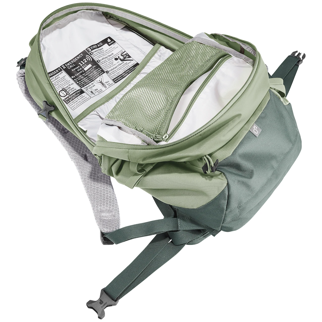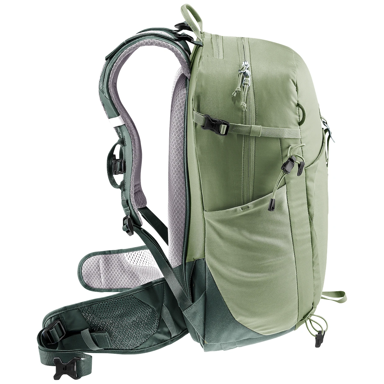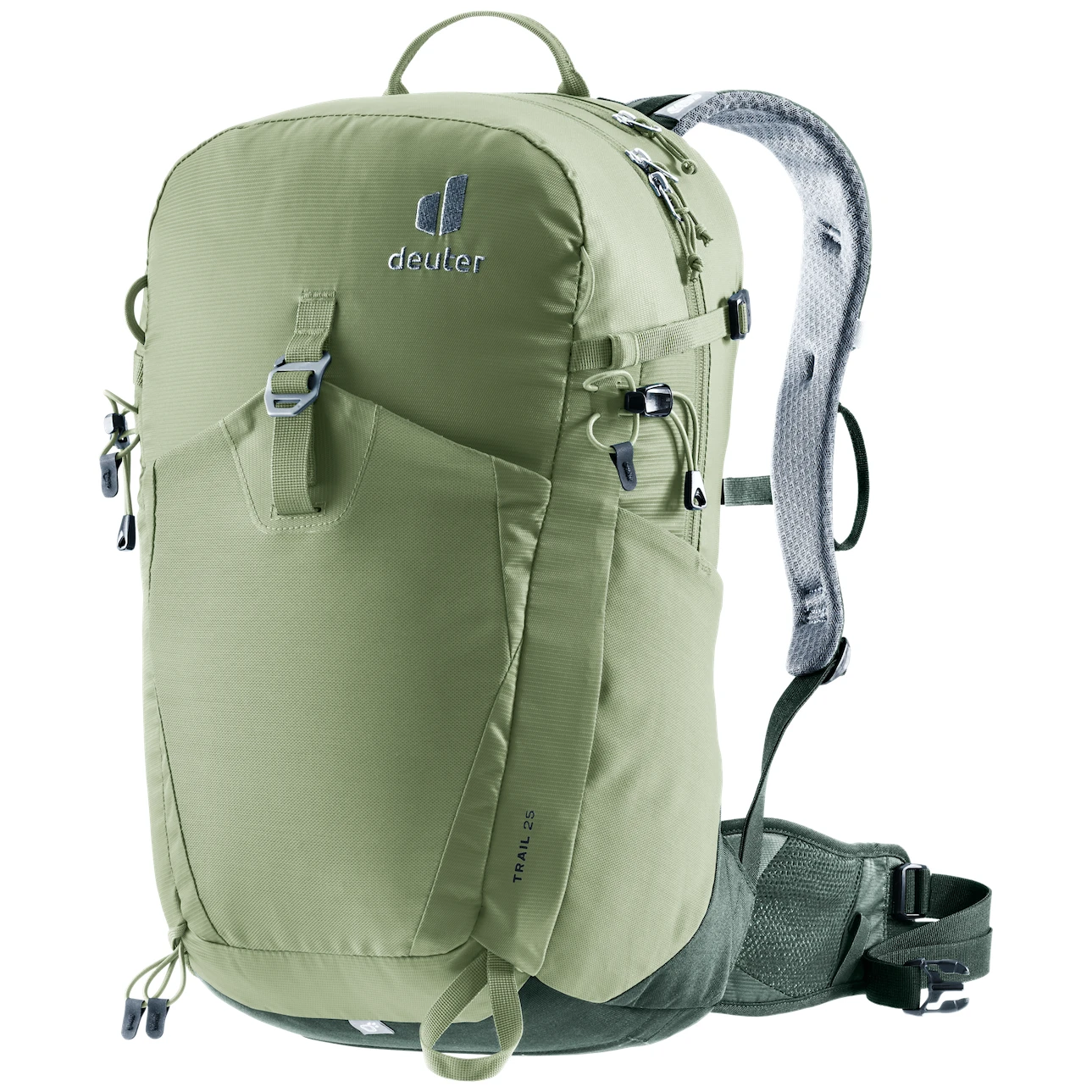 Trail 25 Wanderrucksack Marke Deuter mit reduzierter Kontaktfläche für den Rücken. Der Rucksack hat sehr atmungsaktive Träger und einen faltbaren Hüftgurt. Das Rückensystem ist das sog. Delrin® U-Rahmen für bessere Unterstützung des Rucksacks, wenn dieser nicht voll beladen ist. Der Rucksack selbst verfügt über eine große Fronttasche samt Organizer und SOS-Tag. Natürlich ist er für eine 3-Liter-Trinkblase vorbereitet und verfügt über Seitentaschen, inklusive Riemen zur Befestigung eines Eispickels oder von Wanderstöcken.