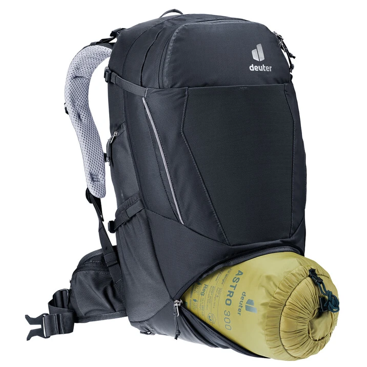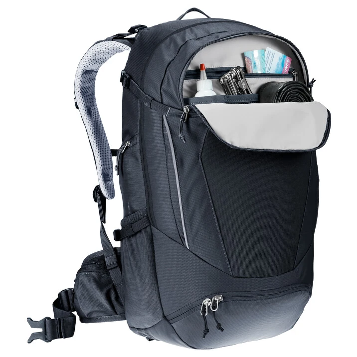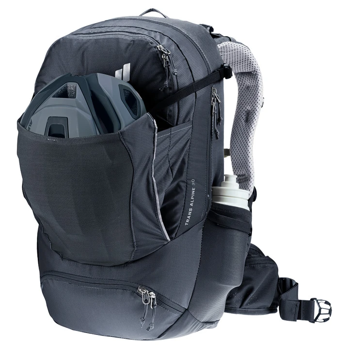 Der vielseitige Trans Alpine 30 Rucksack der Marke Deuter im neuen Design bietet hohe Qualität, funktionelle Ausstattung und zugleich Leichtigkeit. Das neue Rückensystem bietet eine bessere Belüftung dank einer kleineren Kontaktfläche und flexiblere Schultergurte für mehr Bewegungsfreiheit. Um die Wirbelsäule herum befinden sich zwei gepolsterte Einsätze, die besonders atmungsaktiv und bequem sind. Nicht nur zum Wandern, sondern auch zum Radfahren ist der Trans Alpine ein idealer Begleiter, denn er ist mit einer Tasche für Fahrradtoolssowie einer Tasche für Pumpe, Mobiltelefon und Karte auf der Rückseite ausgestattet.