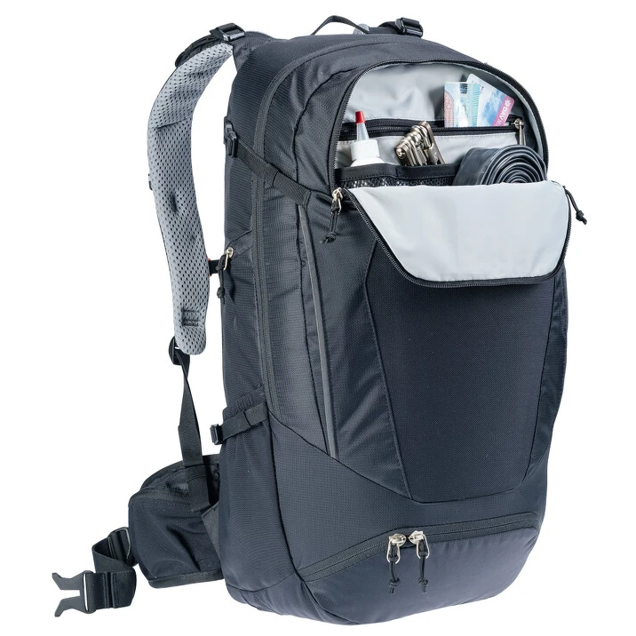 Nicht nur zum Wandern, sondern auch zum Radfahren ist der Trans Alpine ein idealer Begleiter, denn er ist mit einer Tasche für Fahrradtoolssowie einer Tasche für Pumpe, Mobiltelefon und Karte auf der Rückseite ausgestattet. Der Rucksack bietet einen verstärkten Rücken, anatomisch geformte Schultern und – für einen sicheren Sitz – einen Brust- und Hüftgurt mit Tasche. Außerdem sind verstellbare Riemen und Hüftflossen aus Mesh vorhanden. Auch für eine Pumpe ist gut erreichbarer Platz vorhanden.