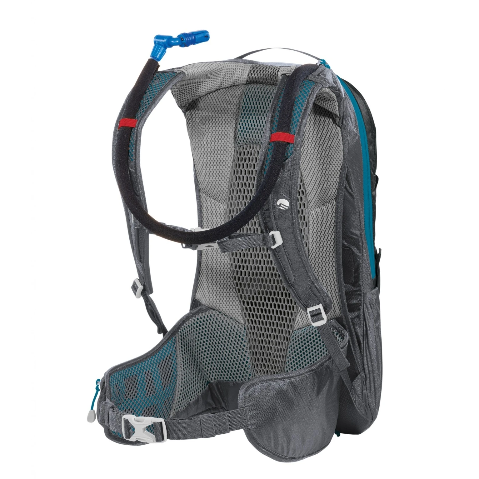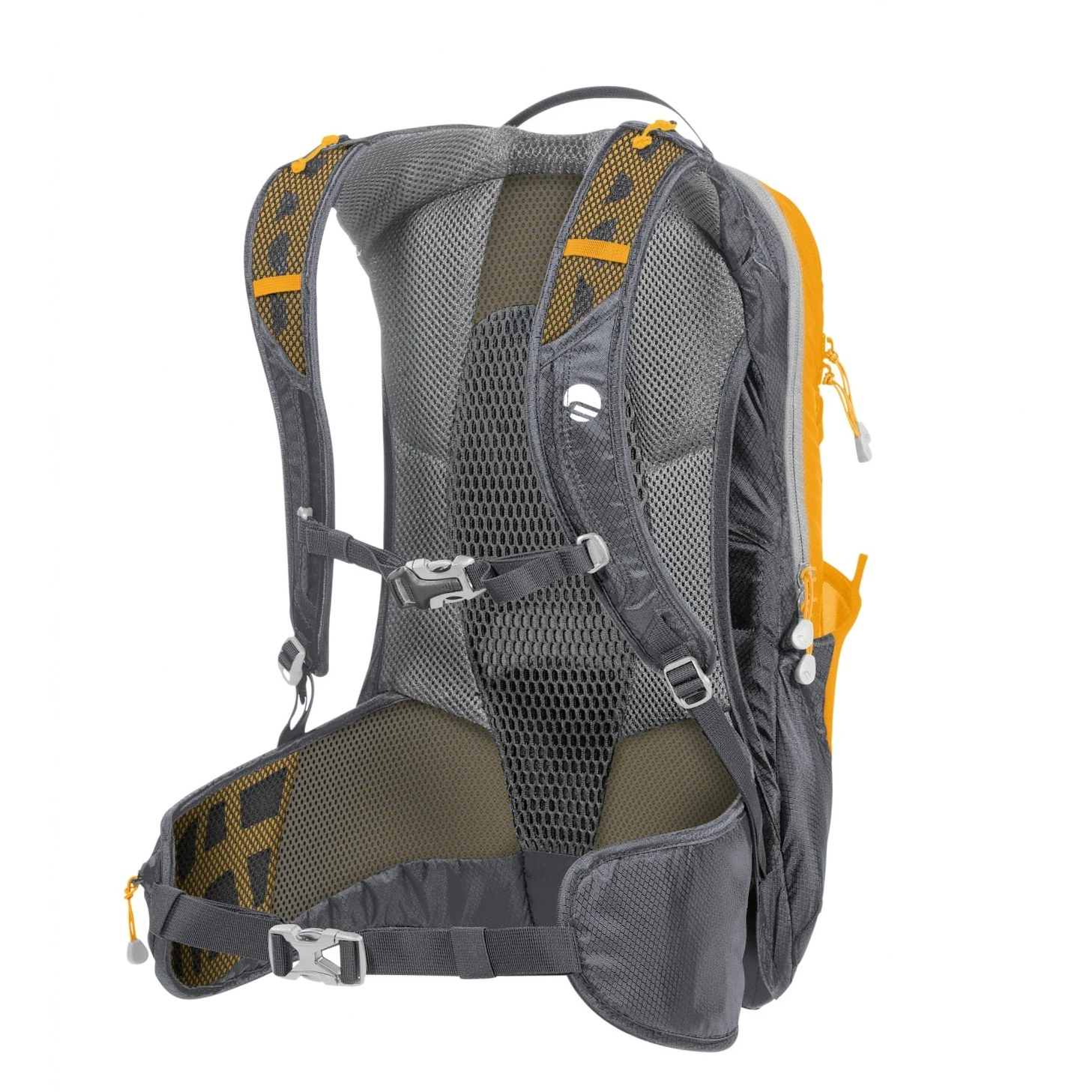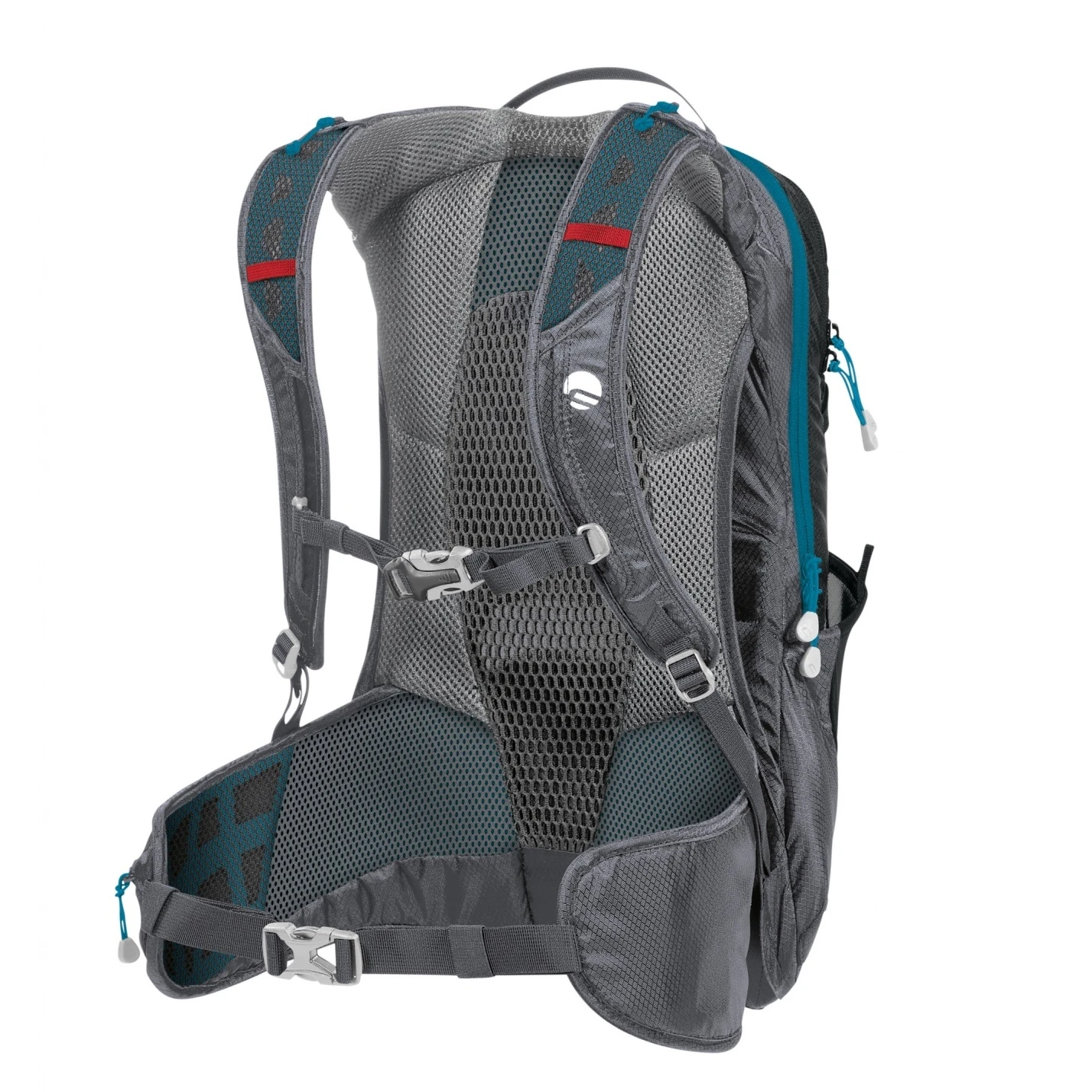 Der Rucksack besteht aus leichtem und robustem Material, das nicht so leicht kaputt geht und zu 100 % recycelt ist. An der Außenseite des Rucksacks können diverse Materialien, wie zum Beispiel Stöcke oder ein Fahrradhelm, befestigt werden. Natürlich darf auch Equipment wie eine Regenhülle für den Rucksack, ein Brustgurt mit Signalpfeife oder eine Tasche für die Trinkblasenicht fehlen.