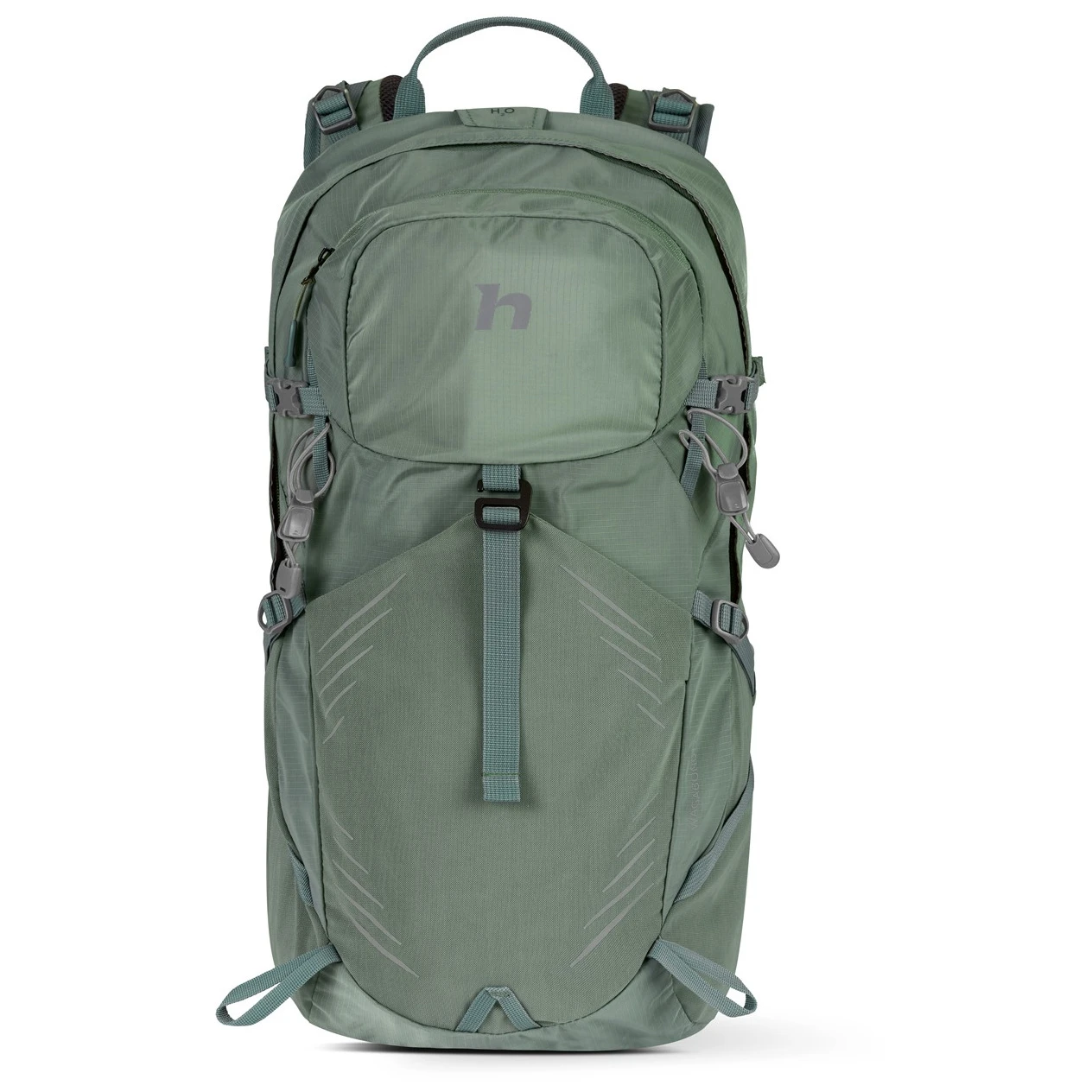 Ausgestattet ist der Rucksack mit einem Brustgurt mit Signalpfeife für mehr Sicherheit, seitlichen Kompressionsriemen für bessere Laststabilität und zwei Trekkingstock-Halterungen. Die praktische Aufteilung umfasst zwei Seitentaschen, eine Fronttasche mit Reißverschluss, eine Fronttasche aus Netzmaterial und eine Tasche mit Auslass für eine Wasserblase. Zur Ausstattung gehören außerdem eine Blinkerhalterung und ein integrierter Regenschutz mit reflektierenden Elementen zum Schutz vor schlechtem Wetter.