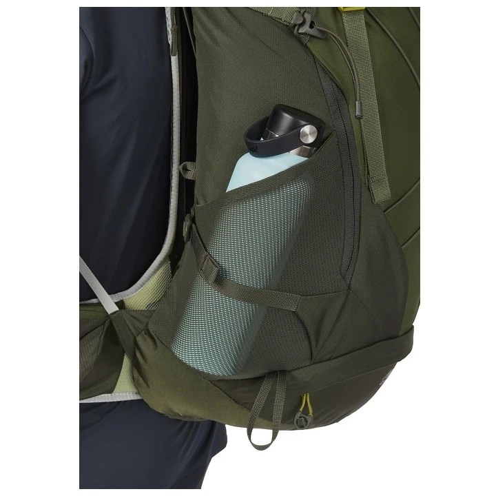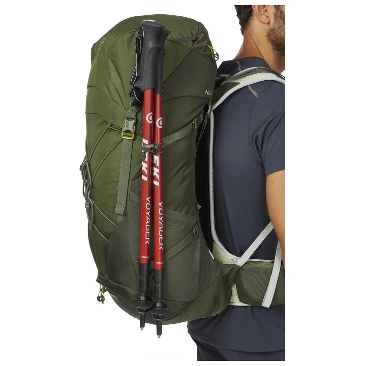 Der Rucksack bietet außerdem ein einfaches System zur Befestigung von Trekkingstöcken und seitliche Kompressionsgurte. Weitere Vorteile sind eine Schlaufe zur Befestigung des Systems, eine integrierte Regenhülle, eine Lichtschlaufe, ein Brustgurt mit Pfeife und ein Schlüsselclip.