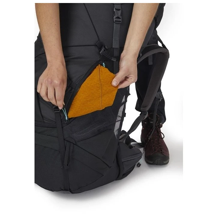 Stauraum bieten seitliche Stretch-Mesh-Taschen, Reißverschlusstaschen am flexiblen Hüftgurt, eine Tasche für eine 3-Liter-Trinkblase und ein System zur Befestigung von Trekkingstöcken, aber auch einer Isomatte oder einem Eispickel. Ebenfalls praktisch sind die elastische Gummispinne zum Trocknen nasser Kleidung, Schlaufen zum Befestigen von Material an der Außenseite des Rucksacks und ein Schlüsselclip.