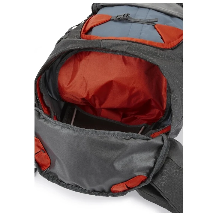 Der Deckel verfügt über eine Außen- und Innentasche, das Hauptfach lässt sich durch Öffnen des Reißverschlusses an der gesamten Vorderseite des Rucksacks schnell erreichen, die Fronttasche eignet sich ideal zum Verstauen beispielsweise einer Karte und sonstige Kleinigkeiten lassen sich in den Taschen am Hüftgurt verstecken. Trekkingstöcke lassen sich einfach an der Vorderseite des Rucksacks befestigen und auch die unteren Kompressionsriemensind praktisch und ermöglichen die Befestigung von weiterer Ausrüstung.