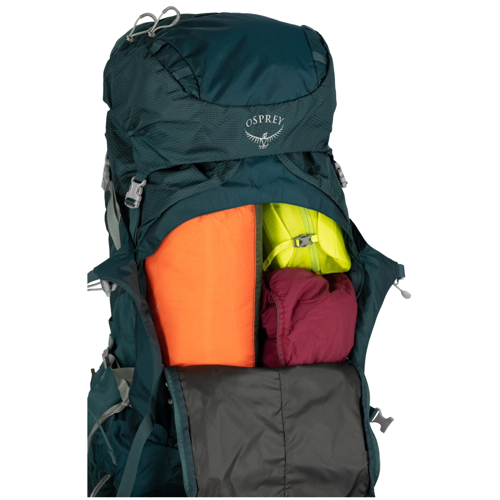 Der Rucksack hat drei Eingänge – den oberen durch das Dach, den vertikalen Reißverschluss vorne und den Reißverschluss unten. So haben Sie alles immer übersichtlich zur Hand. Innen ist es in zwei Kammern unterteilbar. Das untere Fach kann beispielsweise für einen Schlafsack genutzt werden. Außerdem gibt es einen abnehmbaren Regenmantel und eine Tasche für die Trinkblase. Der gesamte Rucksack kann mit StraightJacket-Kompressionsriemen heruntergezogen werden.