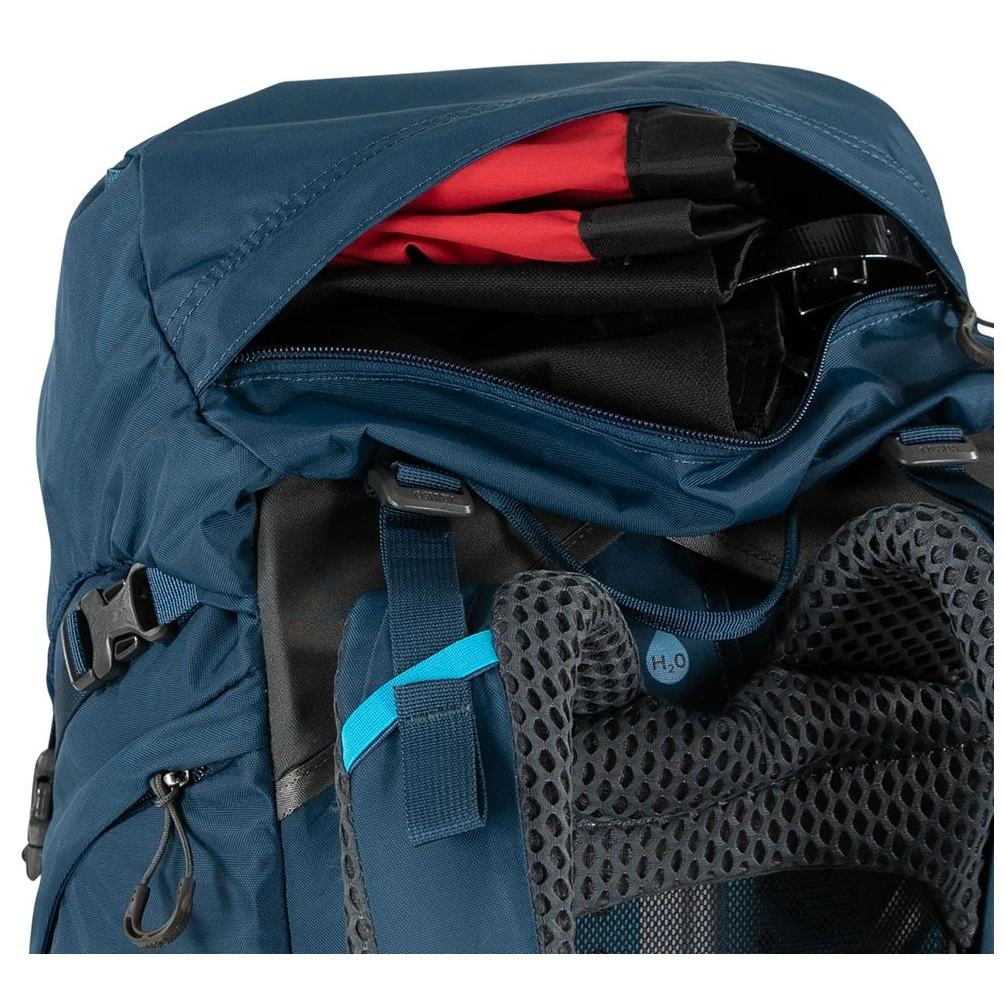 Außerdem gibt es Tragegriffe an der Oberseite, ein internes Reservoir-Fach mit Hydraclip-Befestigung, ein Schlafsackfach mit Reißverschluss und schwebender Trennwand, zwei Schlaufen für Eisgeräte, eine Stow-on-the-Go-Befestigung für Trekkingstöcke und einen seitlichen Reißverschlusszugang zum Hauptfach für eine bessere Organisation. Die Stoffe des Hauptteils und des unteren Teils sind bluesign®-zertifiziert.