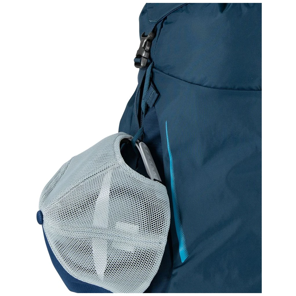 Zum Schutz vor schlechtem Wetter ist ein integrierter Regenmantel vorhanden. Stauraum wird geboten durch einen oberen Deckel mit einer großen Reißverschlusstasche, eine Reißverschlusstasche aus Netzmaterial unter dem Deckel mit einem Schlüsselclip, eine Fronttasche mit Zwickeln aus elastischem Netzmaterial, zwei Seitentaschen aus elastischem Netzmaterial und Reißverschlusstaschen am Hüftgurt. Für Komfort sorgen außerdem ein stabiler Hüftgurt, zwei schnell lösbare obere seitliche Kompressionsriemen mit Halterung für Axt oder Trekkingstöcke sowie zwei untere seitliche Kompressionsriemen.