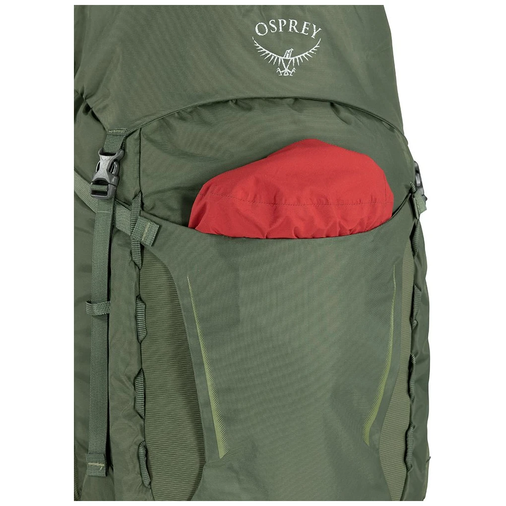 Zum Schutz vor schlechtem Wetter ist ein integrierter Regenmantel vorhanden. Stauraum wird geboten durch einen oberen Deckel mit einer großen Reißverschlusstasche, eine Reißverschlusstasche aus Netzmaterial unter dem Deckel mit einem Schlüsselclip, eine Fronttasche mit Zwickeln aus elastischem Netzmaterial, zwei Seitentaschen aus elastischem Netzmaterial und Reißverschlusstaschen am Hüftgurt. Für Komfort sorgen außerdem ein stabiler Hüftgurt, zwei schnell lösbare obere seitliche Kompressionsriemen mit Halterung für Axt oder Trekkingstöcke sowie zwei untere seitliche Kompressionsriemen.
