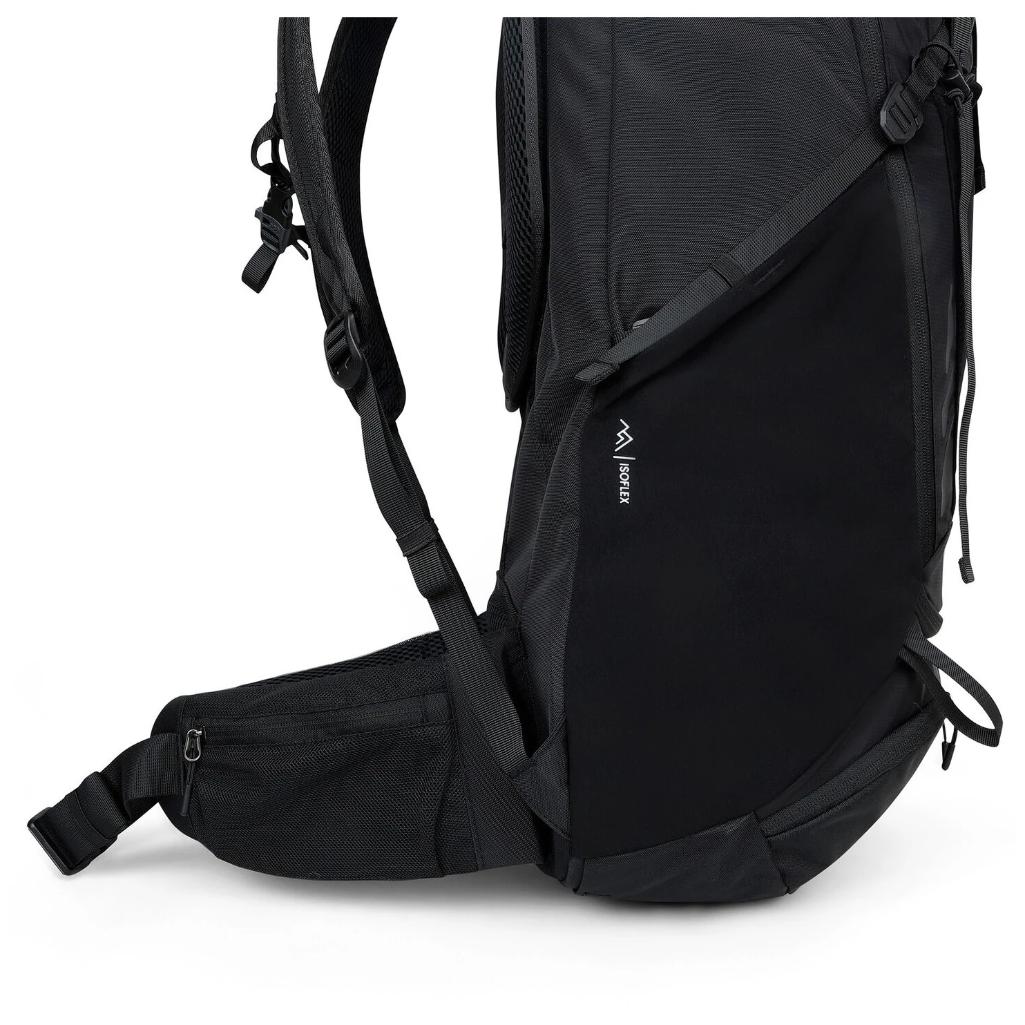 Er ist aus strapazierfähigem Ripstop-Polyamid mit einer wasserabweisenden Ausrüstung ohne PFC und abriebfestem Polyester gefertigt. Das Isoflex-Gewebe, das an den vorderen und seitlichen Taschen verwendet wird, ist elastisch, sodass sich die Taschen auf natürliche Weise je nach Ladung ausdehnen. Sie erreichen das Innere des Rucksacks entweder über den oberen Deckel, der zusätzlich eine Reißverschlusstasche mit einem Fassungsvermögen von 2 Litern besitzt, oder über den vorderen Reißverschlusszugang. An der Unterseite befindet sich ein separates Reißverschlussfach, ideal beispielsweise für einen Schlafsack. Der Rucksack ist mit einer Trinkblase kompatibel. An der Außenseite befinden sich Schlaufen zur Befestigung von Trekkingstöcken, seitliche Kompressionsriemen, reflektierende Elemente, die die Sicherheit erhöhen, und verstellbare Riemen zum Anheben des Rucksacks. Für noch mehr Widerstandsfähigkeit gegen schlechtes Wetter verfügt der Rucksack über eine Regenhülle.