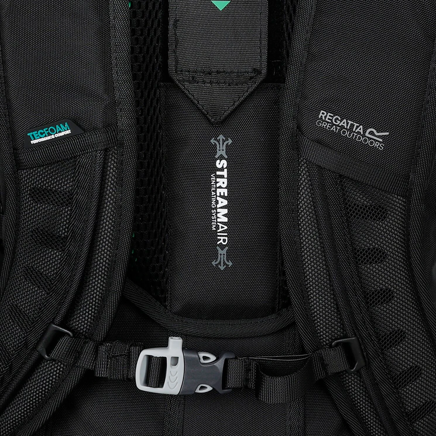 Der Rucksack bietet dank des Adjustfit-Tragesystems, das eine Rückenlängenverstellung im Bereich von 50 - 62 cm ermöglicht, hohen Tragekomfort. Außerdem verfügt der Rucksack über einen verstellbaren gepolsterten Hüftgurt und einen Brustgurt mit einer Sicherheitspfeife. Das Rückensystem besteht aus Tecfoam Comfort-Schaum, der durch StreamAir-Belüftungskanäle und Isovent Performance Air Mesh-Gewebe ergänzt wird. Das Ergebnis ist maximaler Benutzerkomfort, da das System weich und bequem ist und die Luftzirkulation ermöglicht.