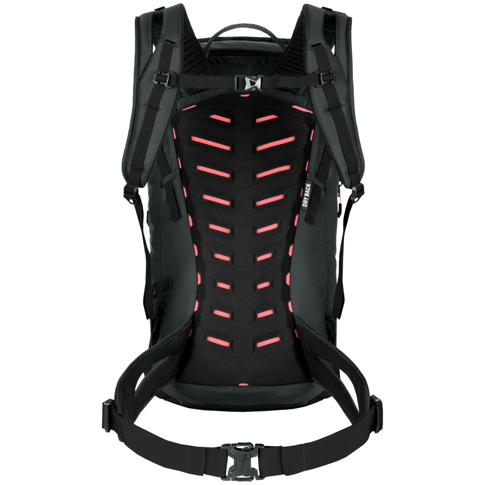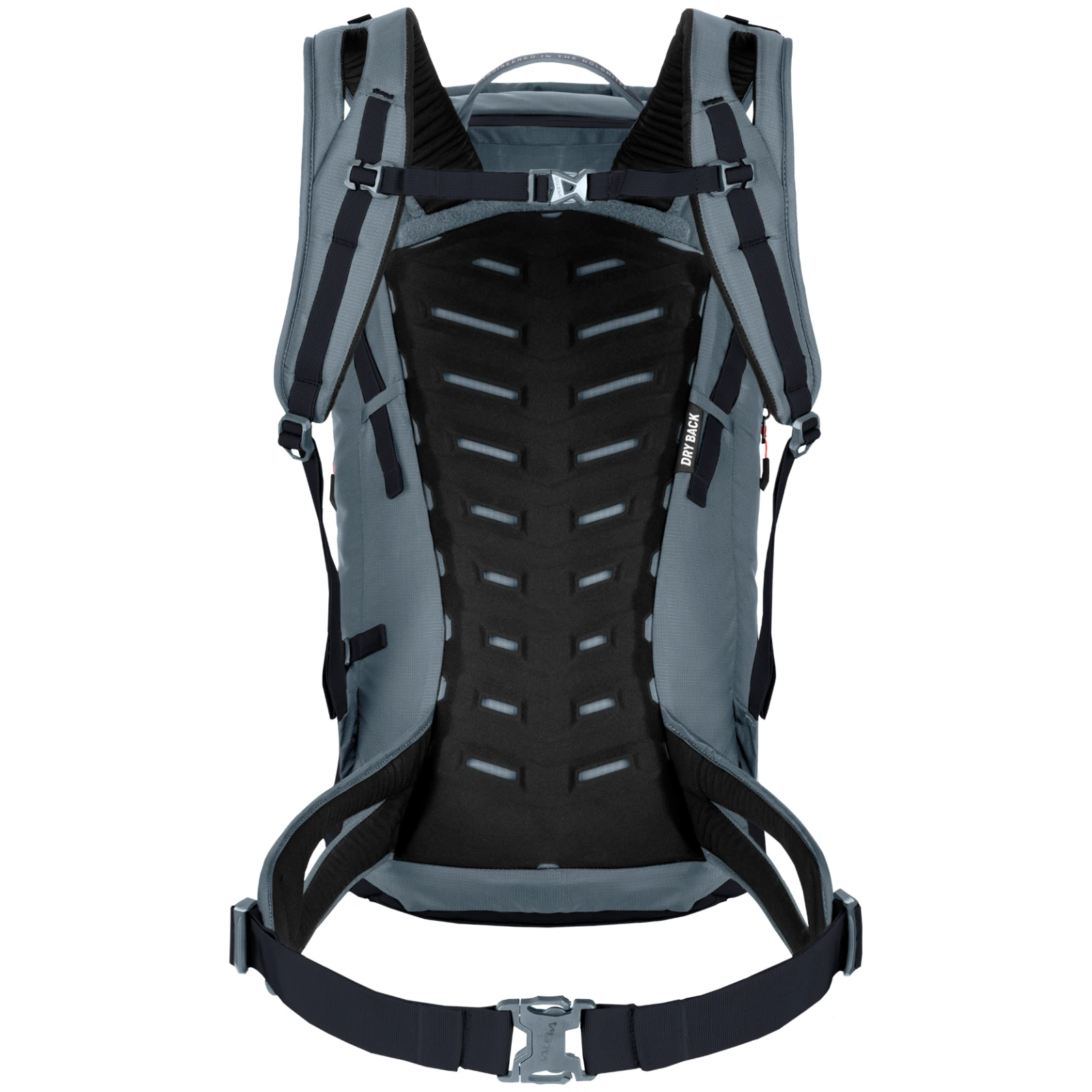 Das Mesh-Rückensystem schafft Platz zwischen Ihrem Rücken und dem Rucksack. Die Luft kann frei zirkulieren, was die Rückenbelüftung verbessert und die Schweißverdunstung beschleunigt. Der Nachteil ist eine leichte Verringerung des Innenvolumens und ein schlechterer Schwerpunkt.