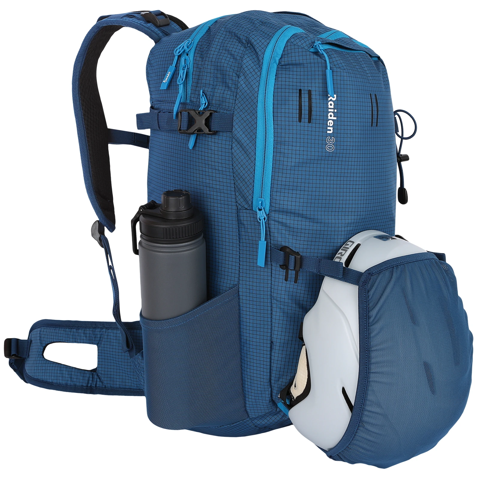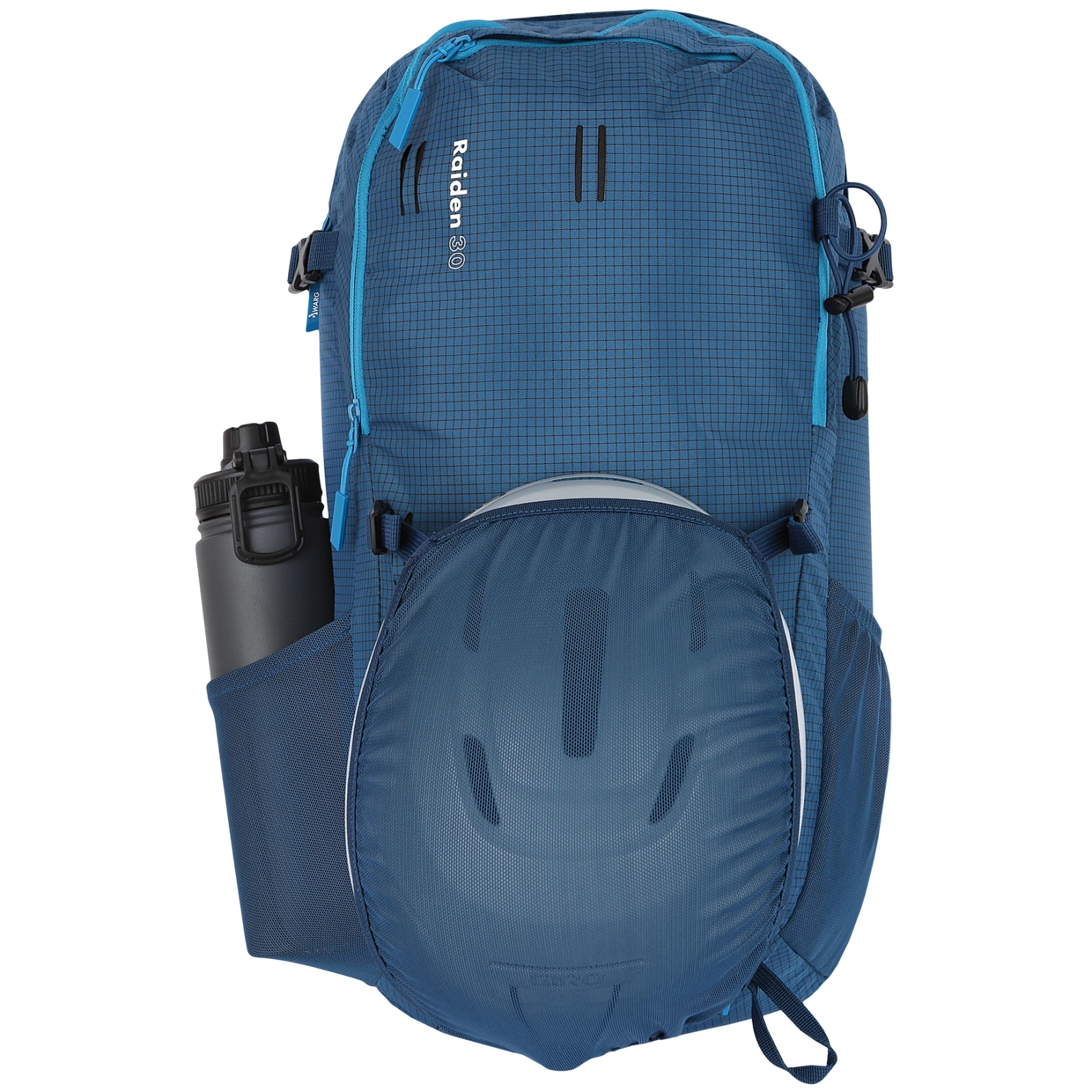 Die Aussparungen auf der Vorderseite dienen zur Befestigung von Karabinern, Fahrradlichtern und anderen Materialien. Es enthält außerdem eine Netztasche für einen Helm. In einer Tasche am Hüftgurt können Sie einen Energieriegel, ein Telefon oder andere kleine Gegenstände sicher verstauen, auf die Sie schnell zugreifen möchten, ohne den Rucksack abnehmen zu müssen. Natürlich ist ein Regenschutz mit reflektierendem Logo und einer Tasche für die Trinkblase dabei.