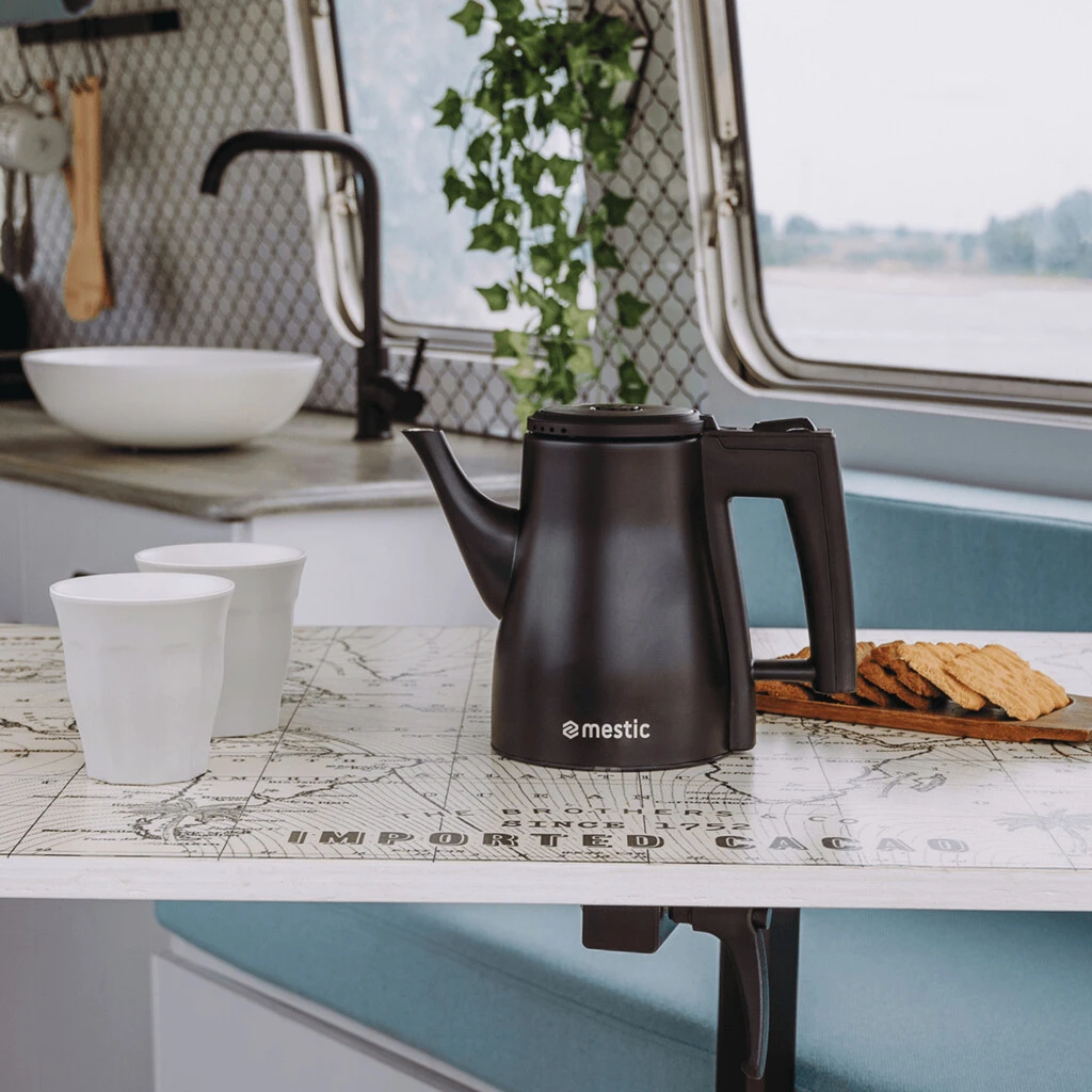 Der Mestic Wasserkocher MWC-120 ist der ideale Helfer für die Zubereitung von Heißgetränken beim Camping. Dank der Leistungsaufnahme von 800 W eignet er sich auch für Orte mit begrenzter elektrischer Leistung, wie z. B. Campingplätze oder Wohnmobile. Der Wasserkocher hat ein Volumen von 0,8 Litern, was für drei Tassen Tee oder Kaffee ausreicht. Sein schwarzes Aluminiumgehäuse wirkt elegant und ist gleichzeitig widerstandsfähig gegen mechanische Beschädigungen.