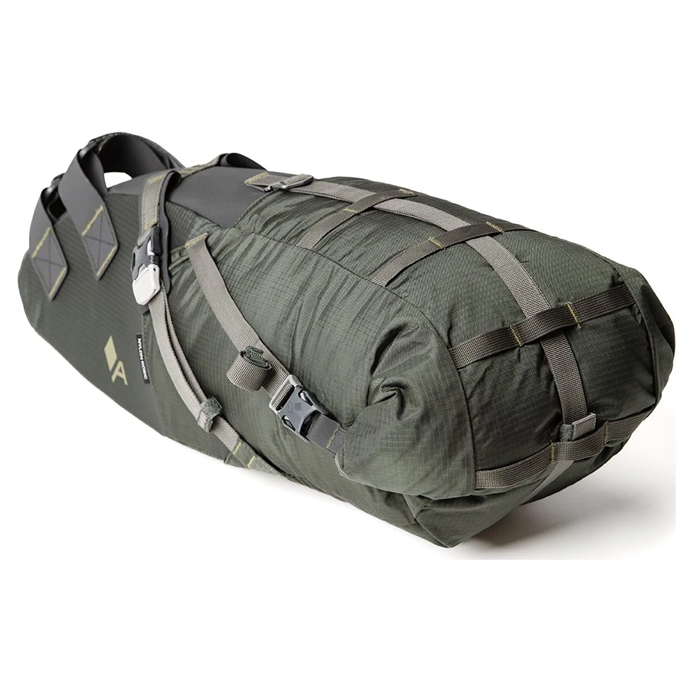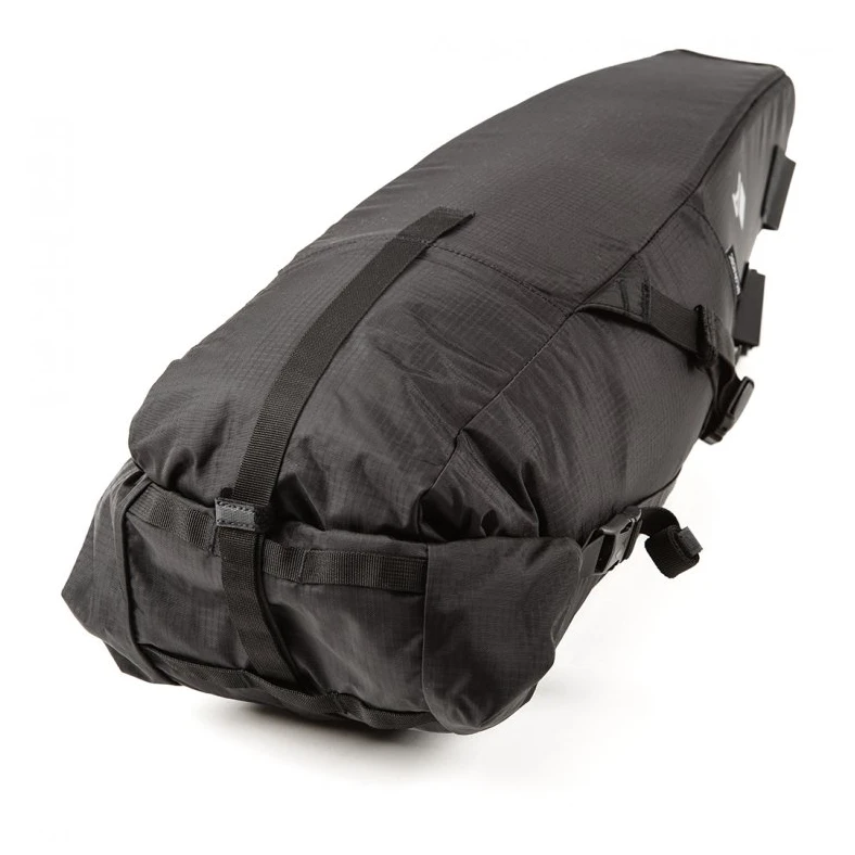 Die Sattelstützenbänder bestehen aus Hypalon mit einer Hypalon-Trägerklappe. Die Riemen um die Sitzstreben bestehen aus Polypropylen, das mit Hypalon vernäht ist, um eine maximal mögliche Fixierung zu gewährleisten und eine Bewegung der Tasche auf den Streben zu verhindern. Das Ganze wird kombiniert mit drei Kompressionsriemen aus Polypropylen, die zu 100 % recycelbar sind, sowie Duraflex- und Nifco-Schnallen für eine einfache Bedienung mit Handschuhen. Es gibt viele Möglichkeiten, Ihre Tasche zu füllen, je nach Ihrer Kreativität und Ihren Bedürfnissen.