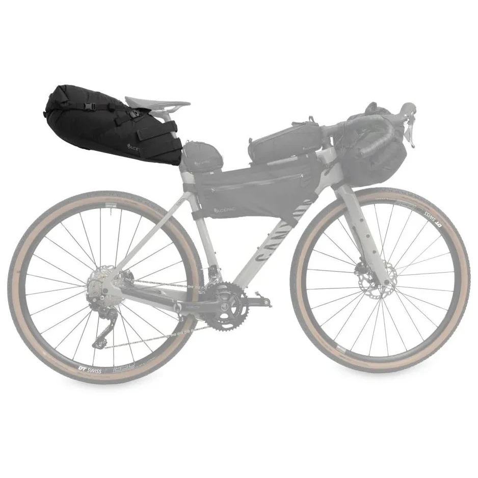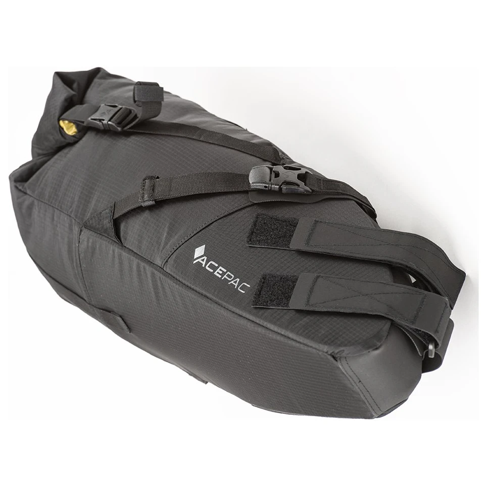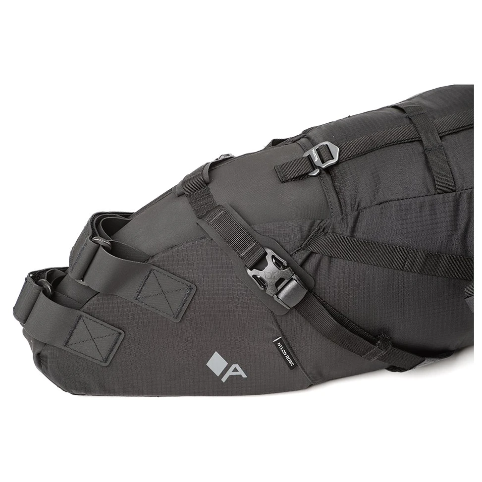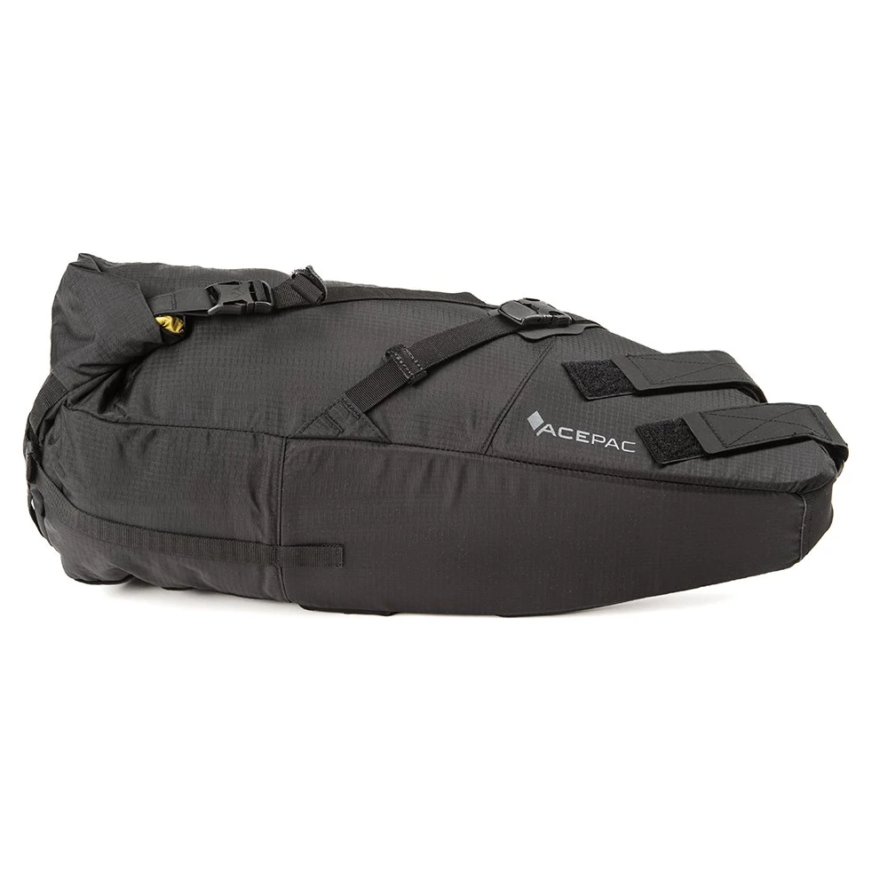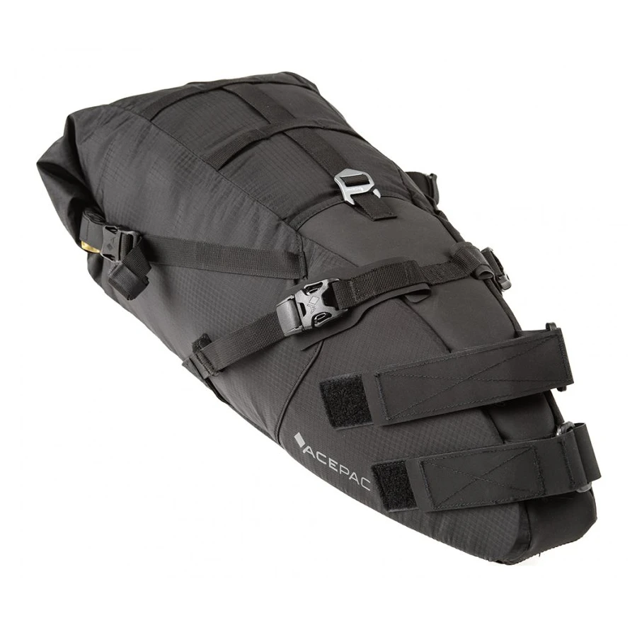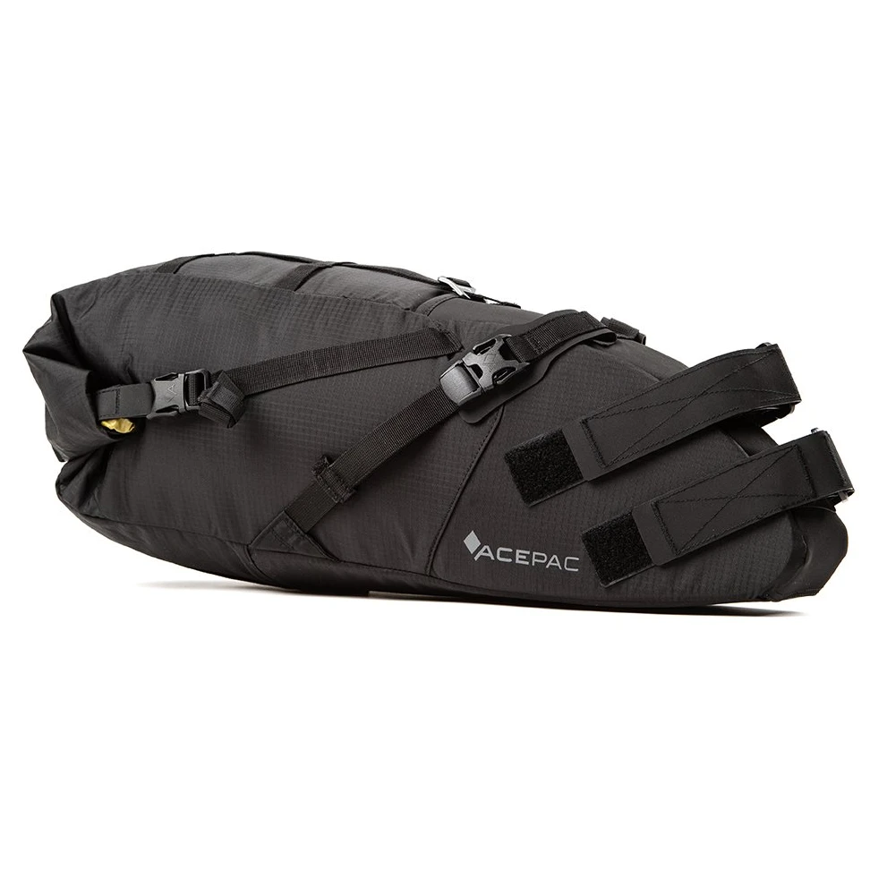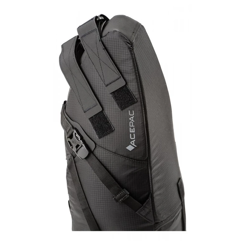 Satteltasche Acepac Satteltasche MKIII ist eine Satteltasche mit einem Fassungsvermögen von 16 Litern und einem herausnehmbaren wasserdichten Innenfutter. Das Hauptmaterial ist Nylon Robic (PU-Beschichtung 1500 mm H2O), ein sehr strapazierfähiger und leichter Stoff. Das abriebfeste und rutschfeste Hypanon-Material bedeckt freiliegende Bereiche, an denen die Tasche die Sattelstütze und die Sitzstreben berührt.