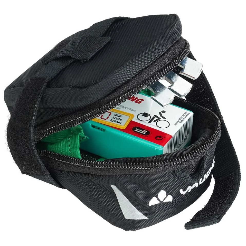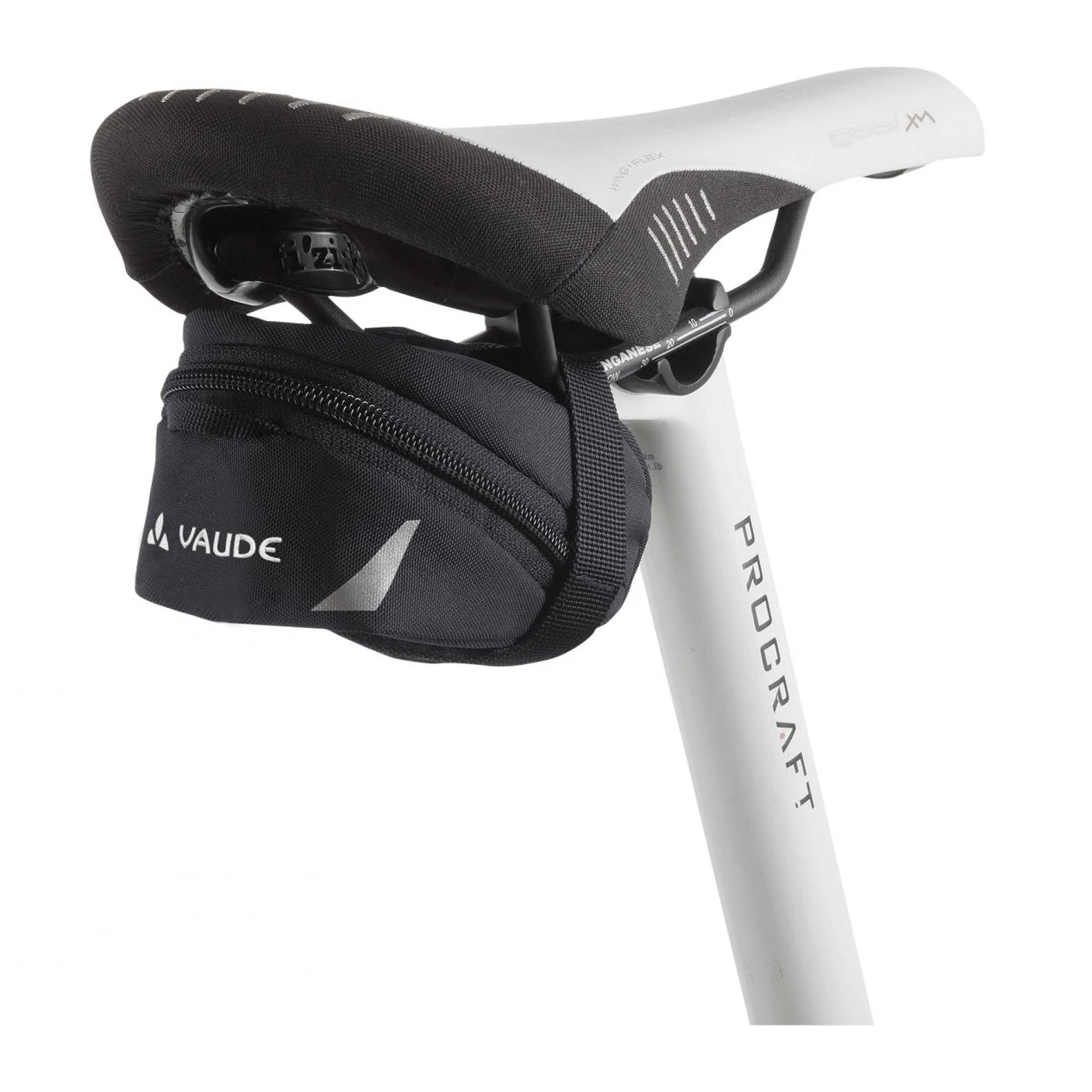 Kleine Satteltasche DieTube Bag S der Marke Vaude ist aus bluesign®zertifiziertem Material gefertigt. Es wird per Klettverschluss unter dem Sattel befestigt und bietet Platz für einen Ersatzschlauch oder das nötige Werkzeug für Reparaturen unterwegs. Es enthält eine kleine Innentasche, reflektierende Elemente und eine Taschenlampenhalterung. Es wird in Deutschland aus nachhaltigen Materialien hergestellt.