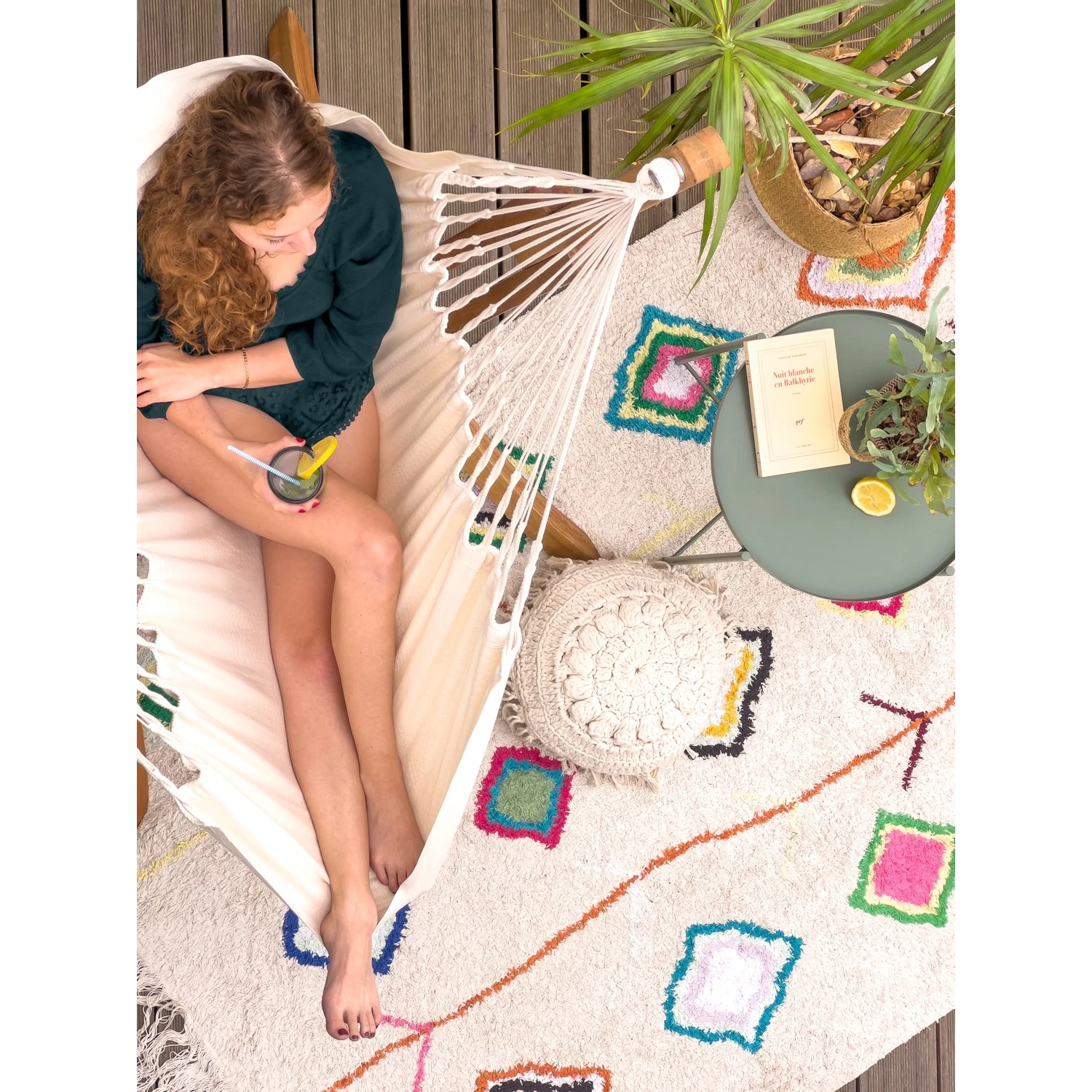 Der Stoff selbst ist extrem weich und dank der langen Fasern außergewöhnlich langlebig . Doppelte Schussfäden an den Kanten verhindern ein Einreißen. Die GOTS -Zertifizierung garantiert, dass auch die Farbstoffe strengste Umweltkriterien erfüllen. Zwei Befestigungspunkte sorgen für ein sanftes, gleichmäßiges Schaukeln, das Sie augenblicklich in einen Zustand tiefer Entspannung versetzt. Genießen Sie überall und jederzeit eine echte Siesta.
