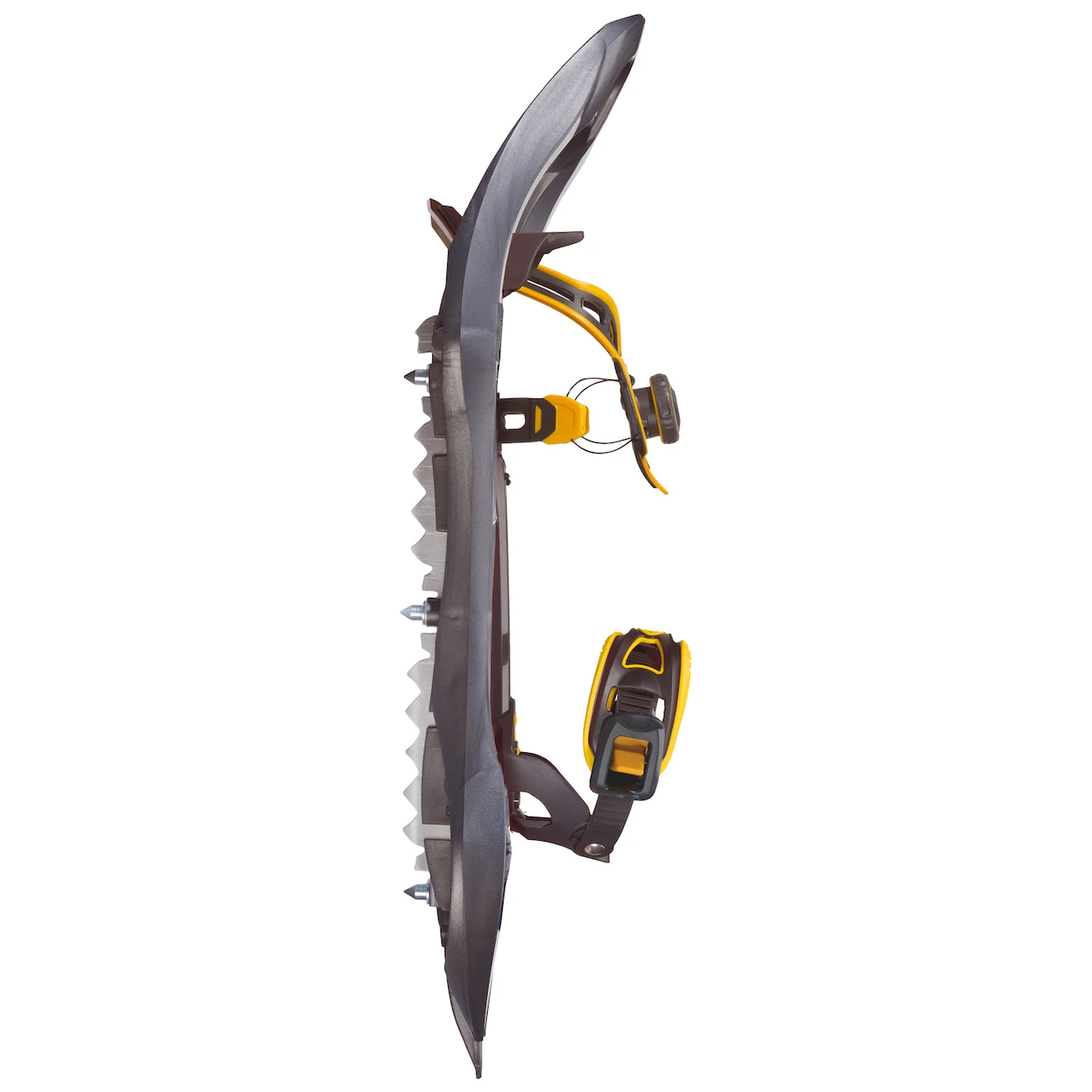 Die Form von Schneeschuhen ähnelt einer Sanduhr. Dadurch sitzen sie beim Gehen angenehm nebeneinander und behindern sich nicht gegenseitig. 3D-Frame-Design sorgt für optimalen Kontakt mit der Oberfläche auf jeder Schneeart. Auf sehr vereisten Oberflächen funktionieren die seitlichen Zähne und die 8 auswechselbaren Stahlspitzen. Vorne befindet sich ein massiver Stahlzahn. Auf weicheren Böden kommen zusätzlich die Quervertiefungen des Rahmens zum Tragen. Im Pulverschnee verteilt sich das Gewicht auf den gesamten Rahmen des Schneeschuhs und man kommt nicht ins Schwitzen.