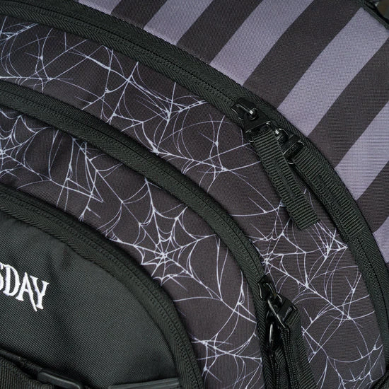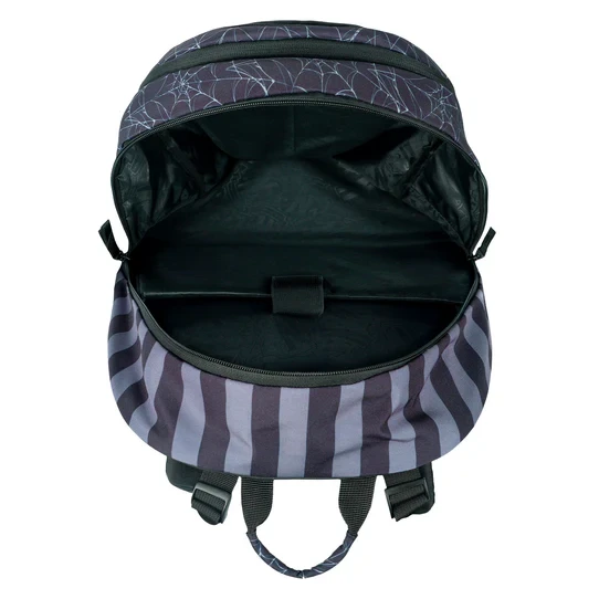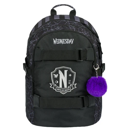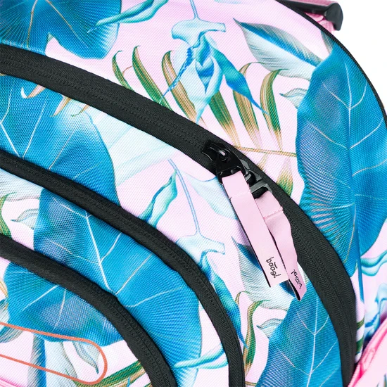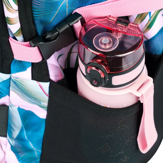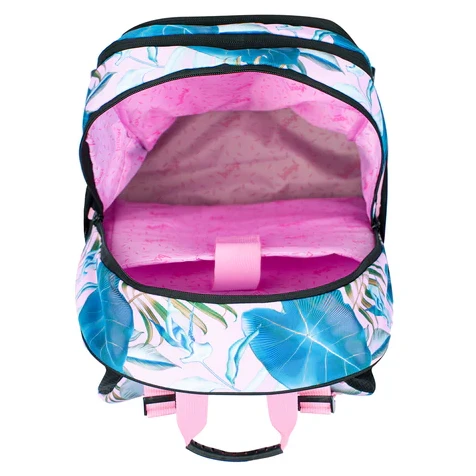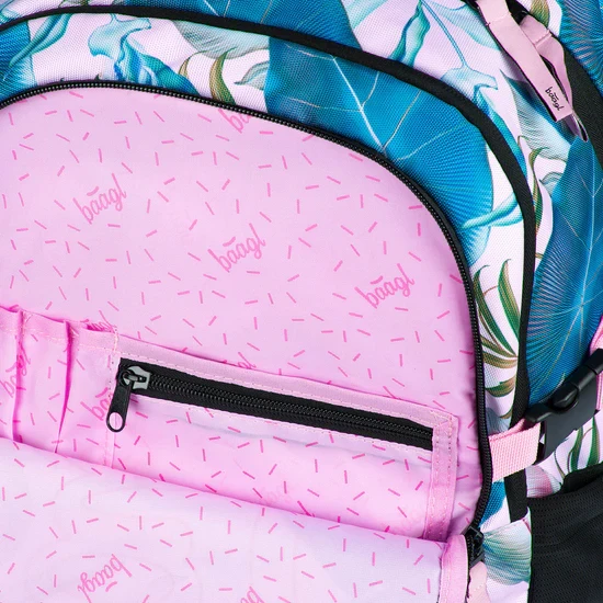 Der Rucksack ist aus robustem und wasserabweisendem Material gefertigt. Er hat drei separate Reißverschlussfächer. Im Inneren befindet sich ein praktischer Organizer und ein Fach für einen 15"-Laptop oder ein Tablet. Zwei seitliche Netztaschen sind ideal für eine Trinkflasche. An der Vorderseite befinden sich Riemen zur Befestigung eines Skateboards. Reflektierende Elemente, die auf allen Seiten angebracht sind, erhöhen die Sichtbarkeit des Kindes bei schlechten Lichtverhältnissen.