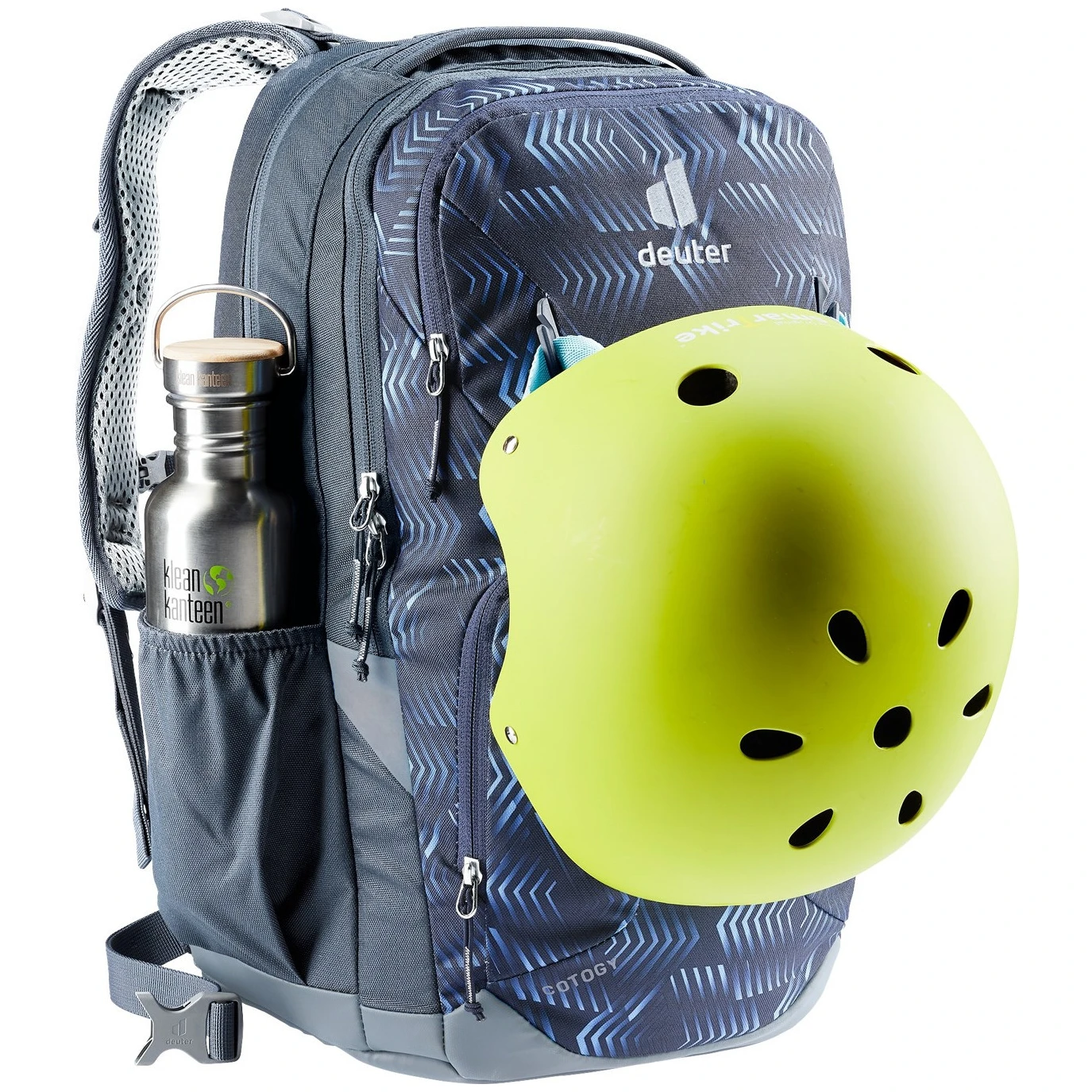 Das Hauptfach im Inneren mit Reißverschluss bietet viel Platz für Schulbücher und ein Fach für ein Tablet oder einen Laptop. Das vordere Reißverschlussfach verfügt über einen internen Organizer, einschließlich einer Reißverschlusstasche für Wertsachen. Der Rucksack verfügt außerdem über eine externe Tasche für ein Mobiltelefon, zwei elastische Seitentaschen und eine Fronttasche mit Reißverschluss. Es gibt ein Brillenaufbewahrungssystem am Schultergurtund einen Helmclip auf der Vorderseite. Der Boden des Rucksacks istmit einer TPU-beschichteten Platte verstärkt, die wasserabweisend ist.