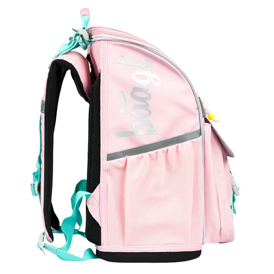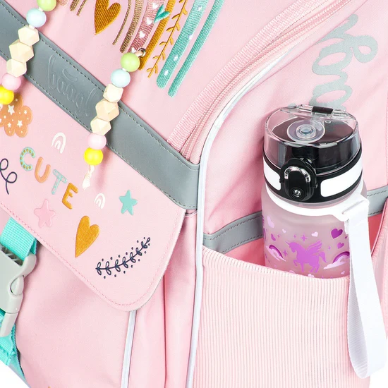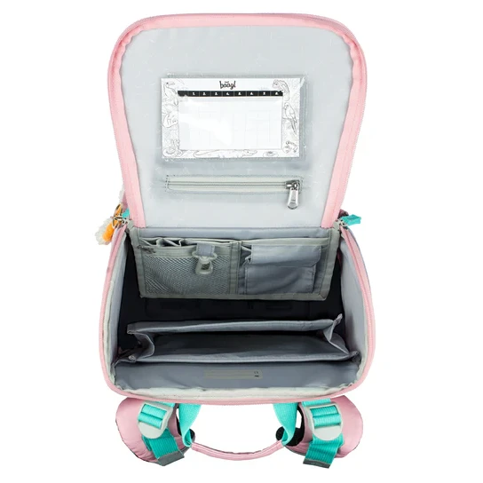 Der Rucksack ist aus einem robusten und wasserabweisenden Material gefertigt. Die verstärkte Konstruktion und der feste Boden sorgen in jeder Situation für eine stabile Form. An der Außenseite befindet sich eine isolierte Vordertasche mit Schnallenverschluss und zwei Seitentaschen mit Reißverschluss, die ideal für eine Trinkflasche sind. Das Hauptfach ist mit einem aufklappbaren Öffnungssystem zugänglich, das den Zugriff auf die Utensilien direkt aus der Schulbank erleichtert. Es wird mit einem Reißverschluss geöffnet. Im Inneren des Fachs befindet sich ein Organizer, der hilft, das Gewicht der Schulbücher besser zu verteilen, sowie eine durchsichtige Tasche für den Stundenplan. Reflektierende Elemente, die auf allen Seiten angebracht sind, erhöhen die Sichtbarkeit des Kindes bei schlechten Lichtverhältnissen.