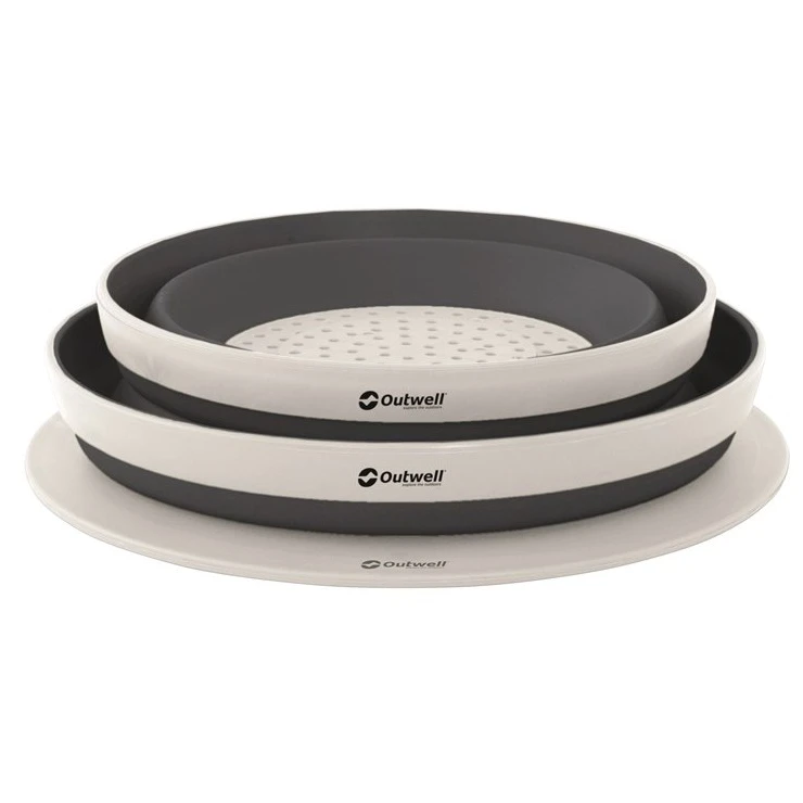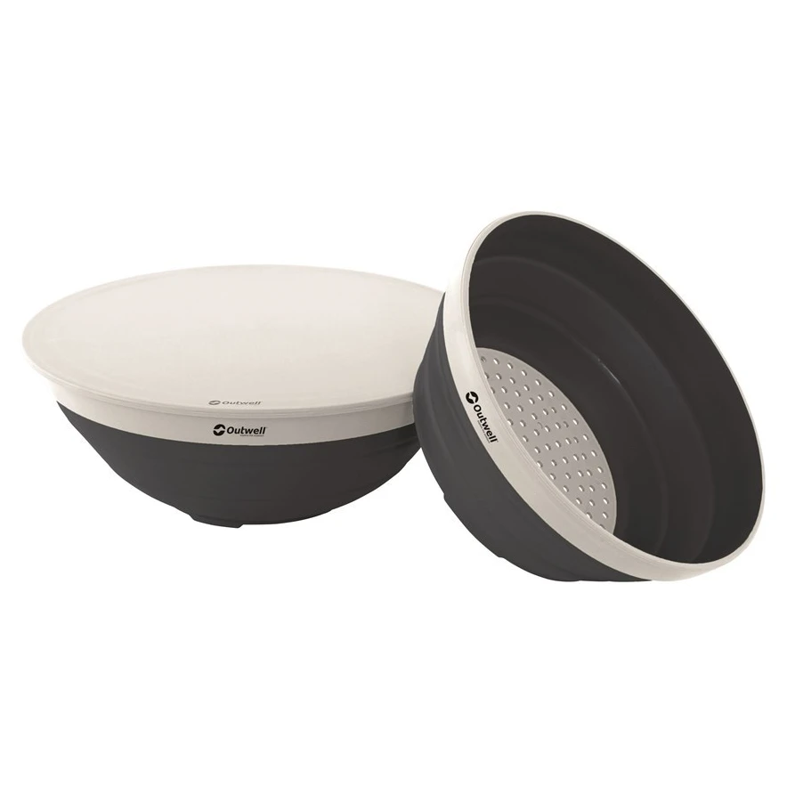 Das Collaps Schüssel- und Sieb-Set der dänischen Marke Outwell eignet sich super für Essen und Snacks für unterwegs und nimmt kaum Platz weg.