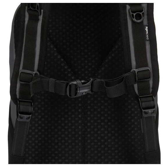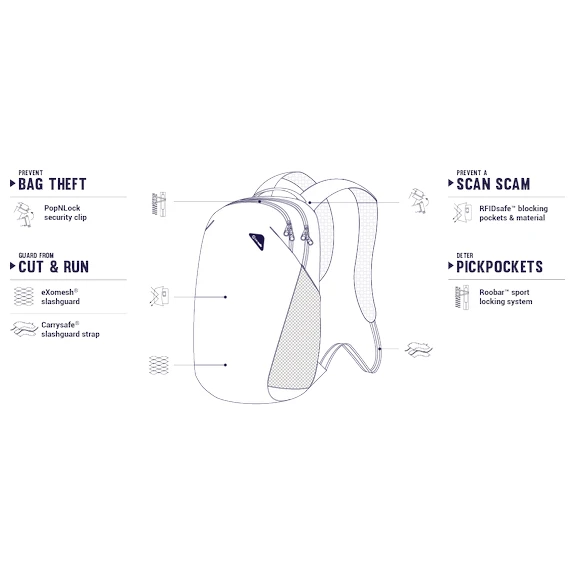 Der Sicherheits- Rucksack Pacsafe Vibe 20l Backpack verfügt über zahlreiche Sicherheitsfunktionen, die Diebe daran hindern, Ihre Dokumente oder Wertsachen zu stehlen. Das erste dieser Elemente ist der PopNLock-Sicherheitsverschluss, der den Gurt schnell und zuverlässig öffnet bzw. schließt und verriegelt. So können Sie Ihren Rucksack beispielsweise an einem Stuhl im Restaurant befestigen. Um ein Durchschneiden der Gurte zu verhindern, sind diese mit zwei Stahlseilenverstärkt. Ein Durchschneiden des Rucksackkörpers wird durch das eXomesh ®verdeckte Stahlgeflechtverhindert. Der Rucksack verfügt außerdem über das Roobar® Sport Reißverschluss-Verriegelungssystem, mit dem Sie die Schieber miteinander verbinden und an der Metallverstärkung verriegeln können, und eine RFIDsafe® - Tasche , die vor dem Auslesen und anschließenden Missbrauch von Karten und Dokumenten schützt.