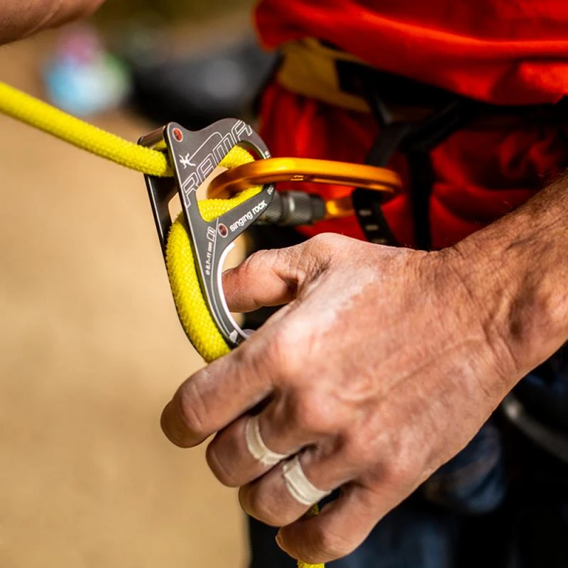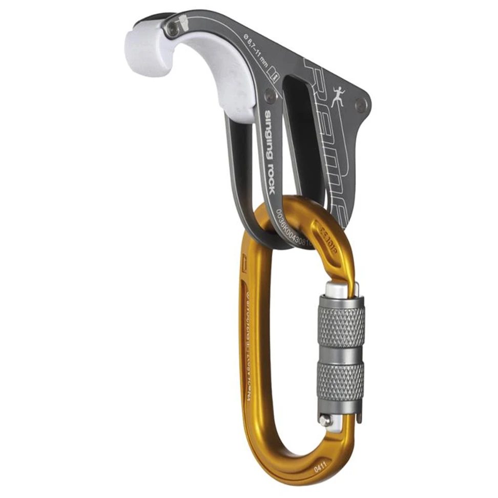 Halbautomatisches jSicherungsgerät Modell Rama der tschechischen Marke Singing Rock zum Sichern beim Sportklettern und Klettern von Einseillängenrouten. Dieses Hilfsmittel mit erhöhter Bremswirkung ist für Einfachseile mit einem Durchmesser von 8,7 bis 11 mm geeignet. Das Sicherungsgerät ist sehr einfach zu bedienen – nach dem Prinzip eines Abseilgeräts – und für Anfängergeeignet. Sie werden nicht nur die reibungslose Funktionsweise, sondern auch den reibungslosen und sicheren Start zu schätzen wissen. Die Nase des Sicherungsgerätes ist mit gehärtetem Kunststoff ausgestattet, welcher die Reibung bei einem Sturz erhöht. Der robuste und leichte Duraluminium-Karabiner verfügt über eine doppeltwirkende Drehverschluss-Sicherung. Durch die ovale Form lässt es sich an den Verbindungspunkten ganz einfach drehen. Die große, glatte Innenfläche verringert den Karabinerverschleiß und verbessert das Gleiten des Seils.